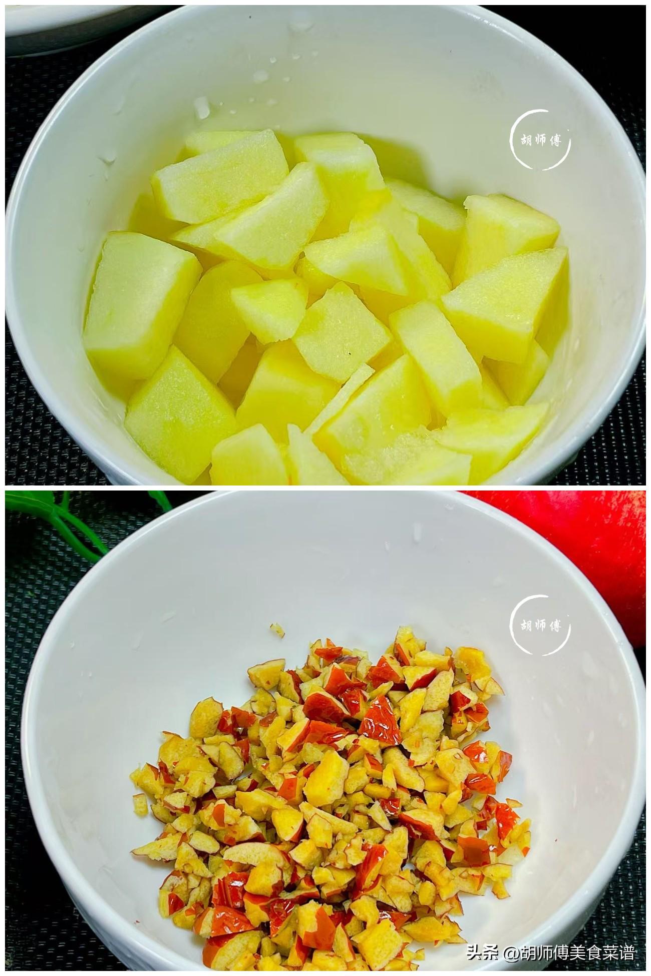 第一步:將山藥削皮洗淨後切成小段,然後將蘋果削皮洗淨後切成小塊,接着再把紅棗洗淨後切成小碎末備用。