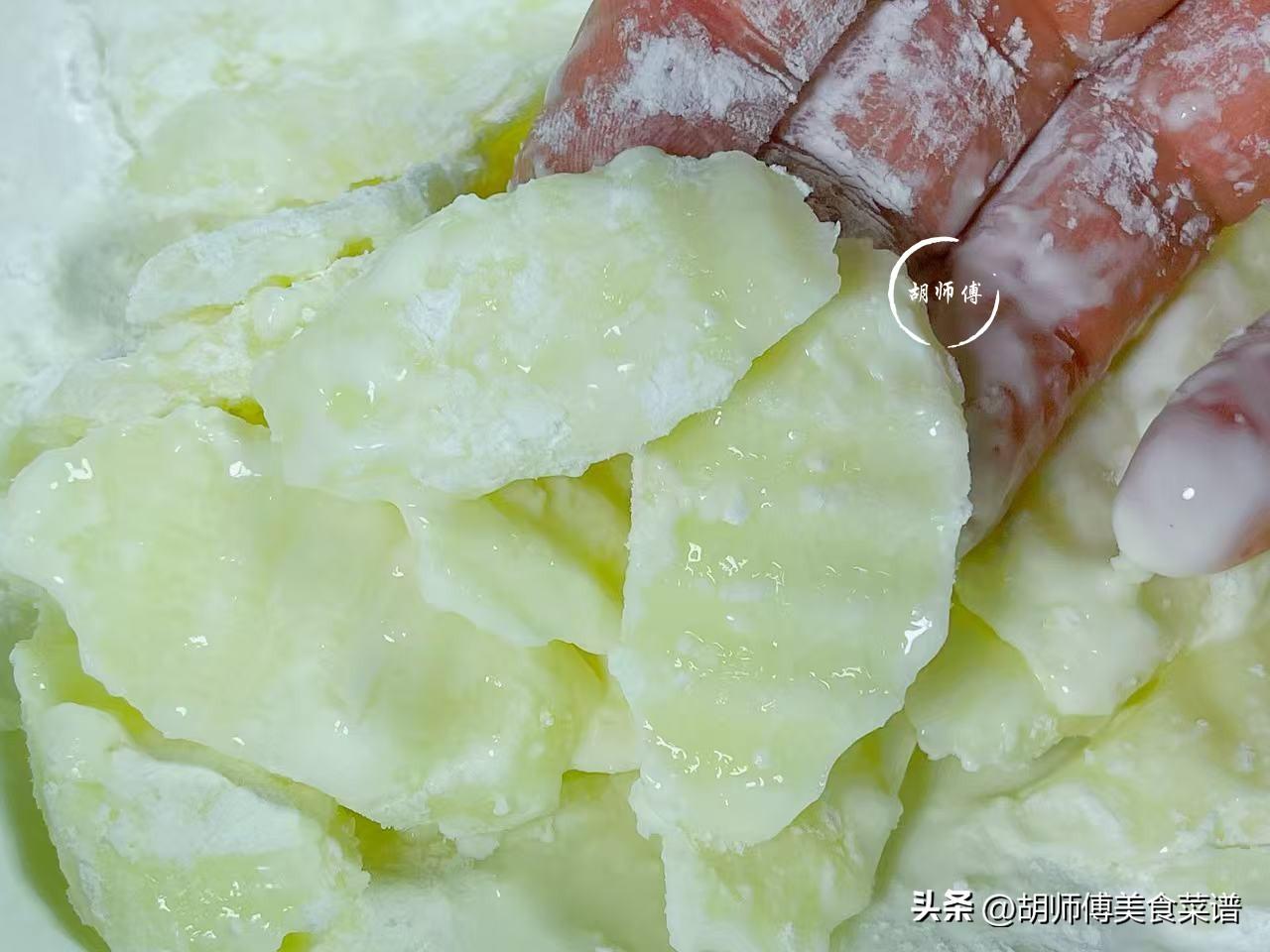 第一步:將山藥削皮後洗淨,然後將山藥切成0.3釐米厚的薄片,接着再把山藥放入澱粉中滾一圈,使每片山藥表面都粘上少許澱粉即可備用。