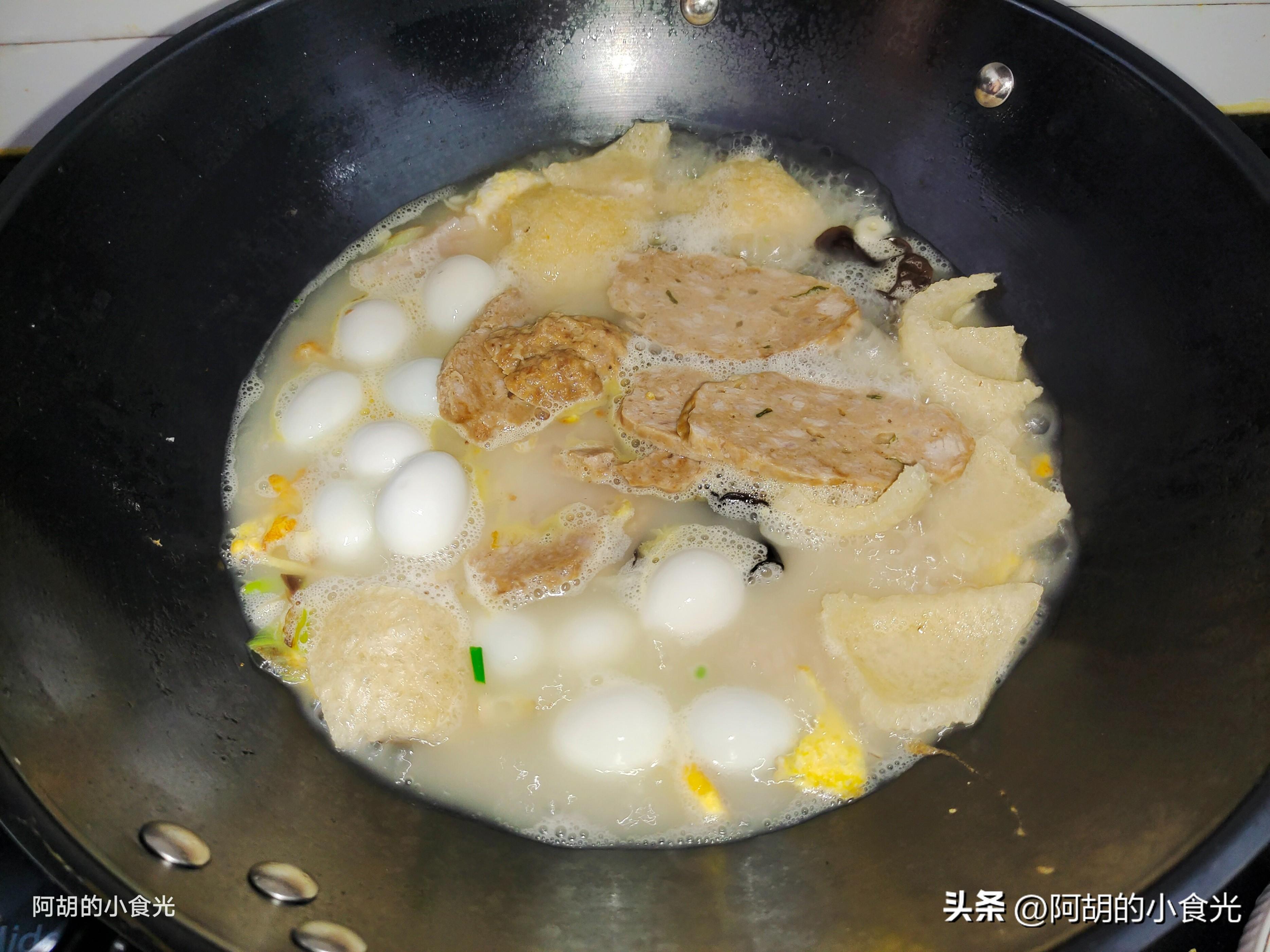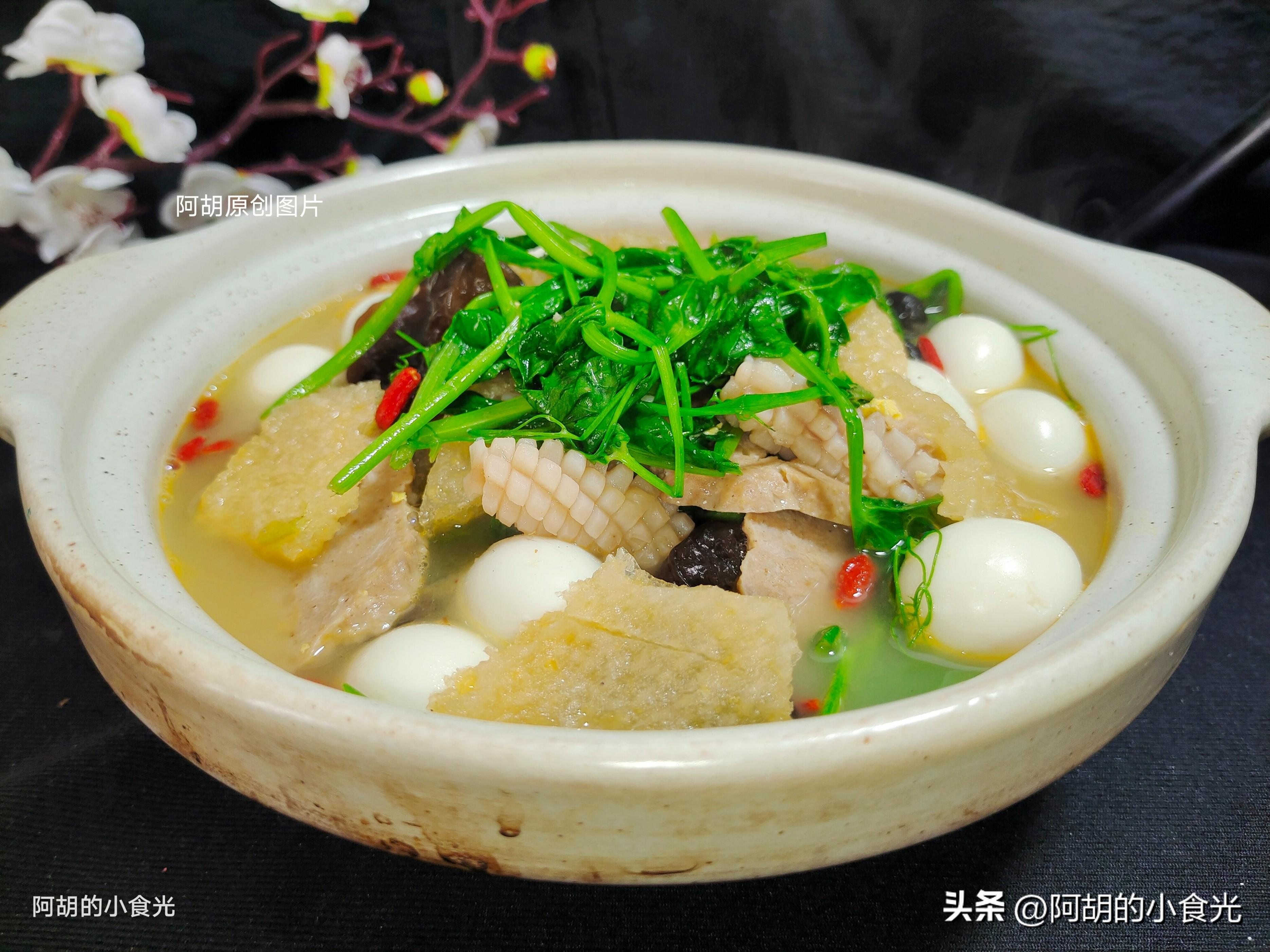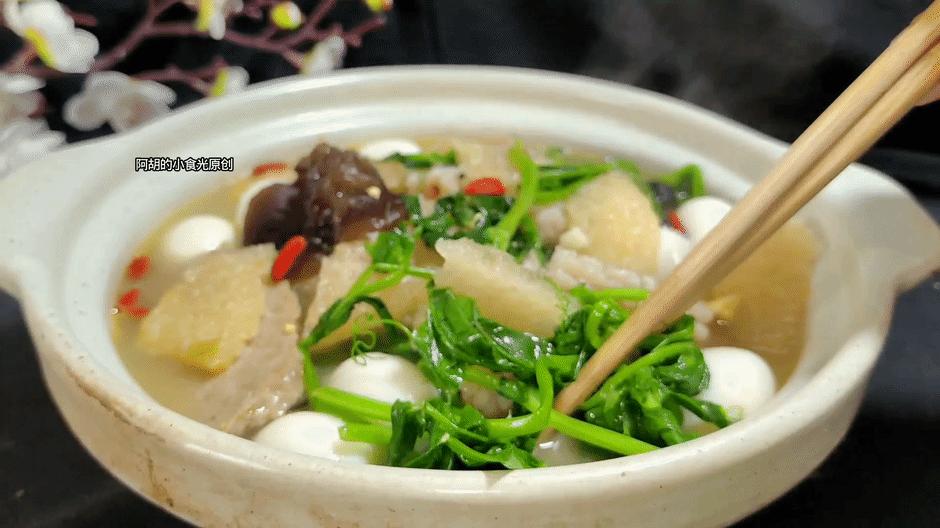 這道菜的食材特別豐富,有魷魚、鵪鶉蛋、肉糕、皮肚、木耳等等,最關鍵的是最後加入的一把時令鮮蔬“豌豆尖”,這個季節正是喫它的好時機,鮮鮮嫩嫩,清香好味好營養,嫩到簡單燙一燙就能喫,值得試一試。