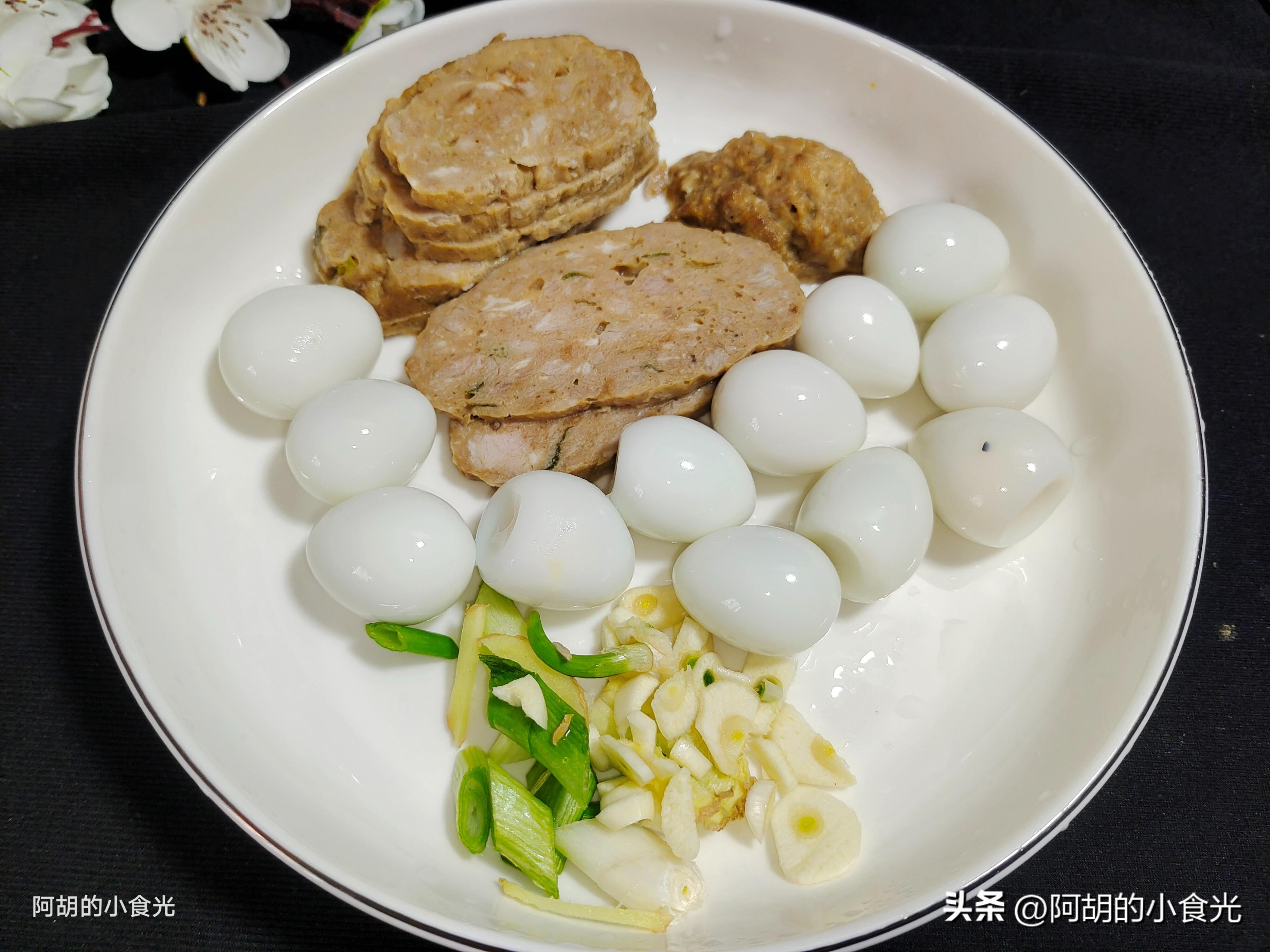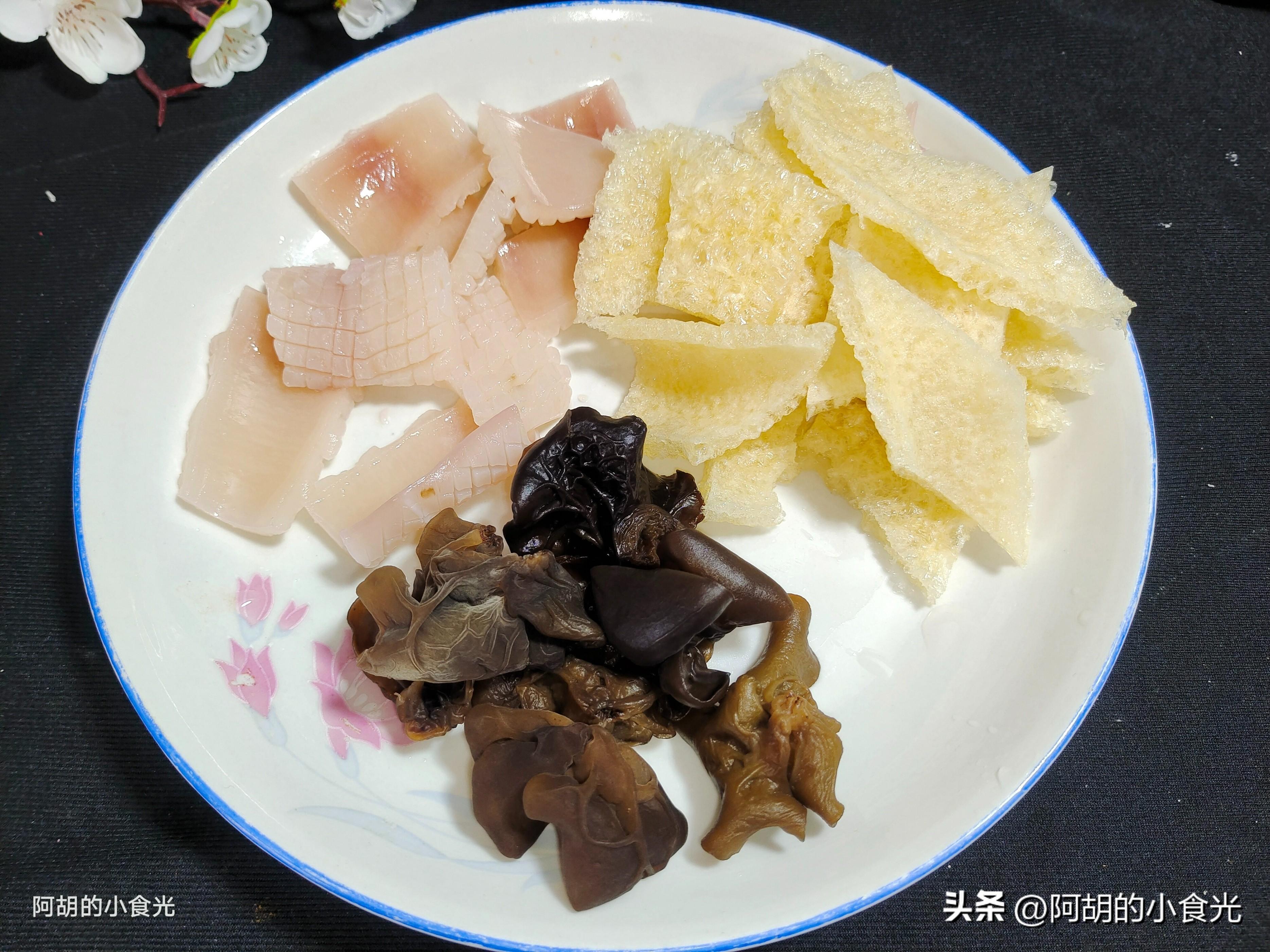 第二步:既然是雜燴做法,那各種配菜必定很是豐富,主要有魷魚花洗淨待用,一塊皮肚用溫水泡軟後切片,少許的幹木耳泡發後待用。除此之外還有煮熟的鵪鶉蛋適量,一塊肉糕切片待用,還有一些蔥薑蒜作爲小料使用。這其中魷魚花、皮肚和木耳可以提前焯水一次。沒有肉糕這個食材的可以用油炸的豬肉丸代替即可。