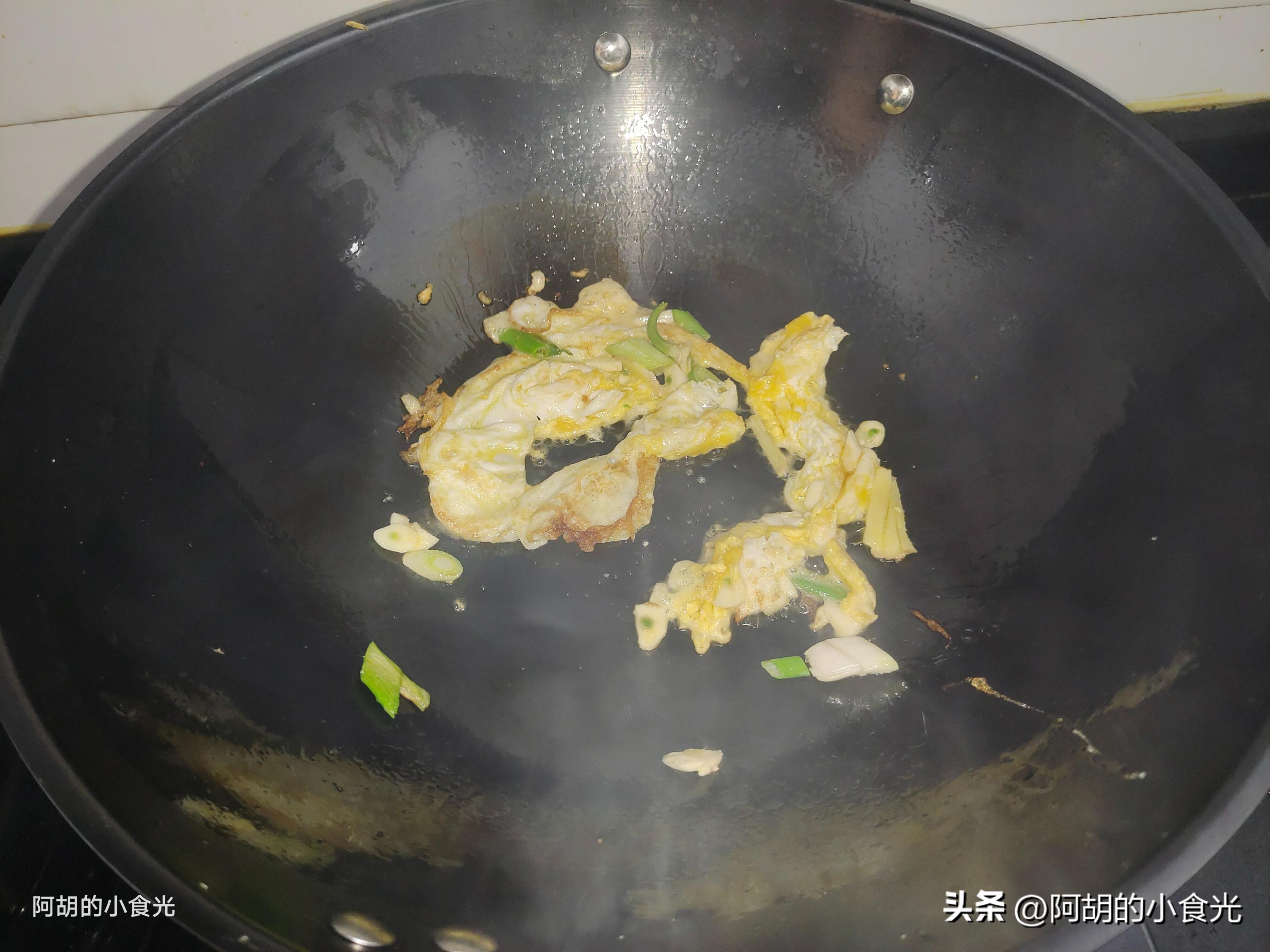 第三步:基本主要的食材都備好就可以開火烹飪了。先小火把鍋烘乾,淋入一些菜籽油燒熱,而後打入一個雞蛋煎炒一下,炒至雞蛋焦黃出香味的時候就下入蔥薑蒜炒一炒,而後再將皮肚、魷魚花和木耳一塊倒入鍋中,轉爲最大火快速翻炒出食材的香味。