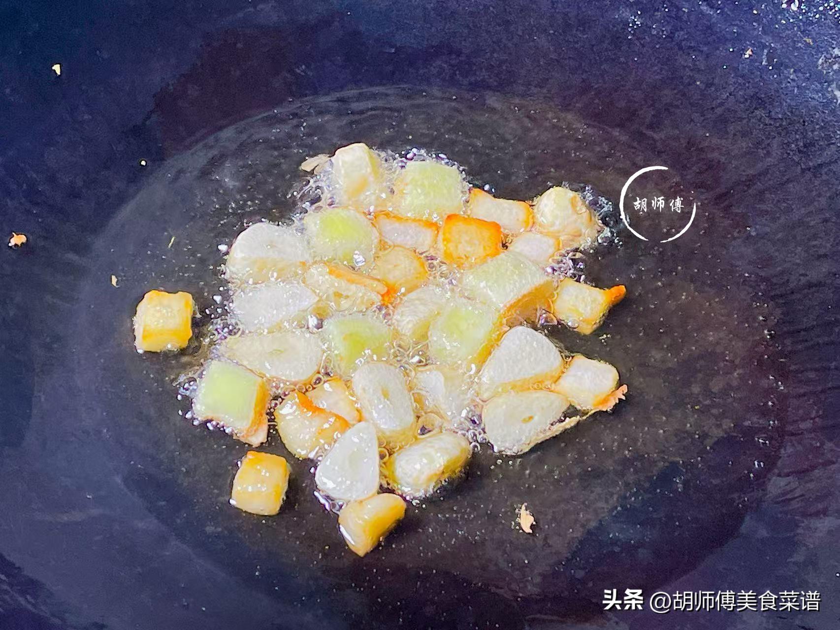 第四步:鍋中放入少許油,然後將肥肉放入鍋中,中小火將肥肉炸成豬油渣後,再把姜粒、蒜粒放入鍋中,大火將它們炸10-15秒,這樣可以激發出它們的香味。