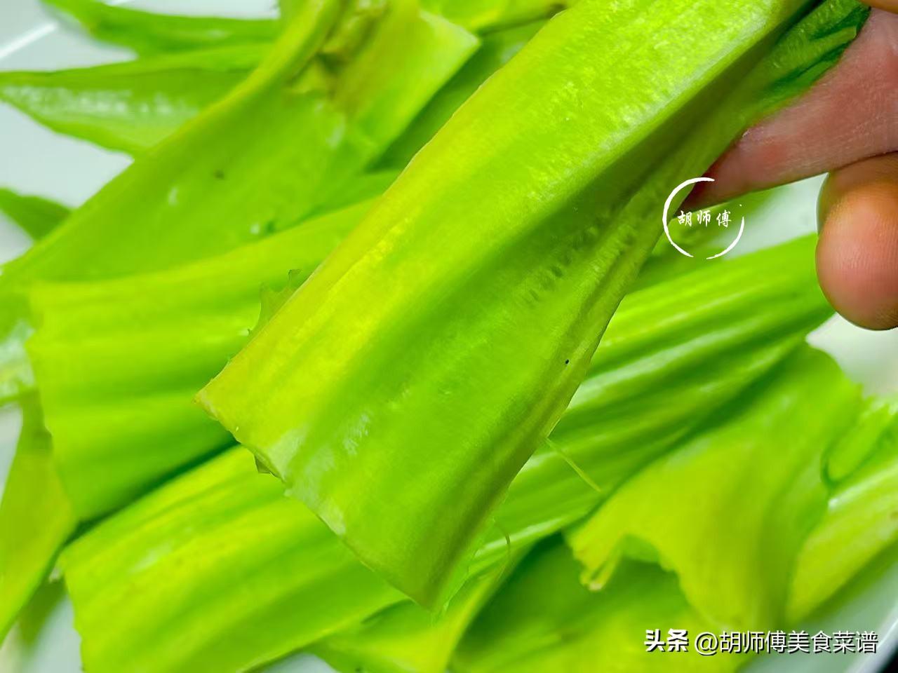 第一步:買回家的芥菜,先把它翠綠的葉片削的扔掉,只留莖備用,把莖沖洗乾淨後,將芥菜莖斜着切成如下圖所示的片狀備用。