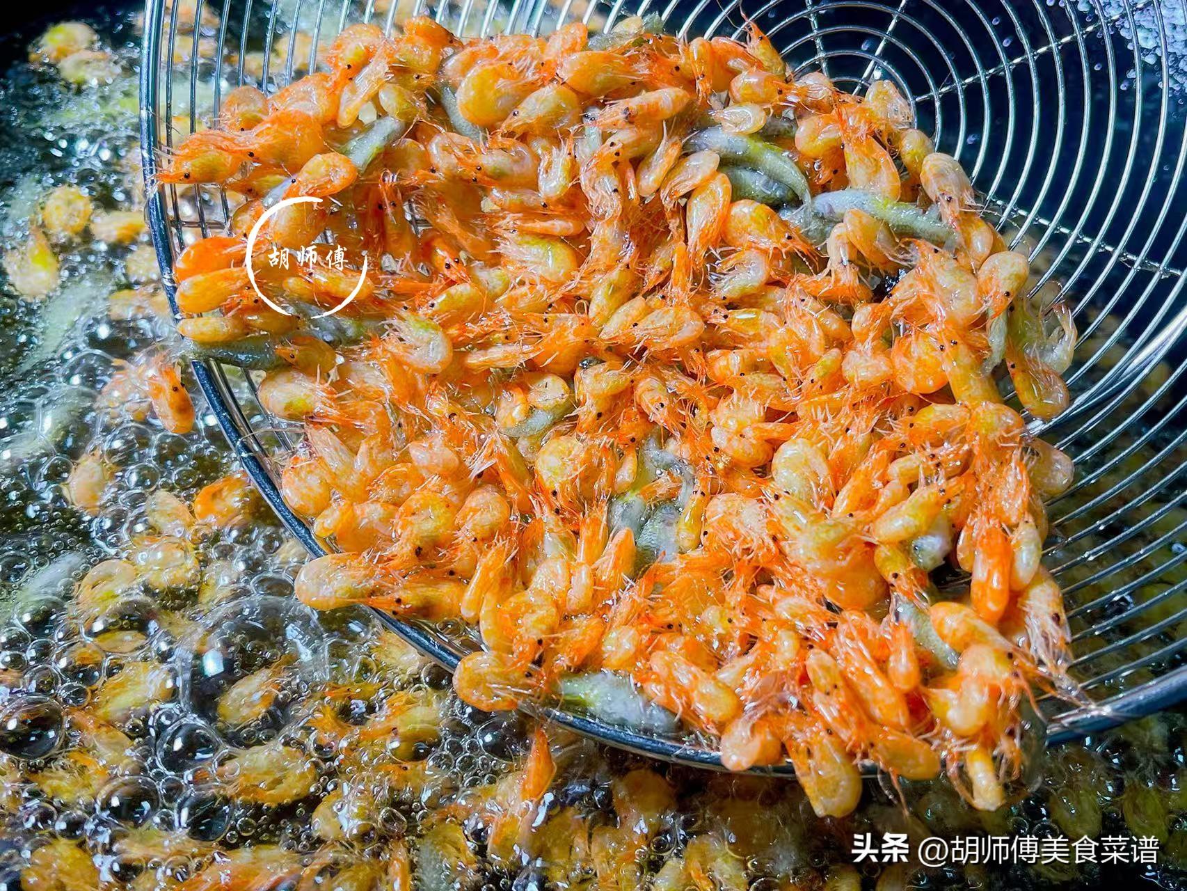 第二步:鍋中放入適量油,等油燒到冒煙後,將洗淨瀝乾水的河蝦放入鍋中,大火將河蝦炸3分鐘左右,直到將河蝦表面炸成金黃色即可撈出。