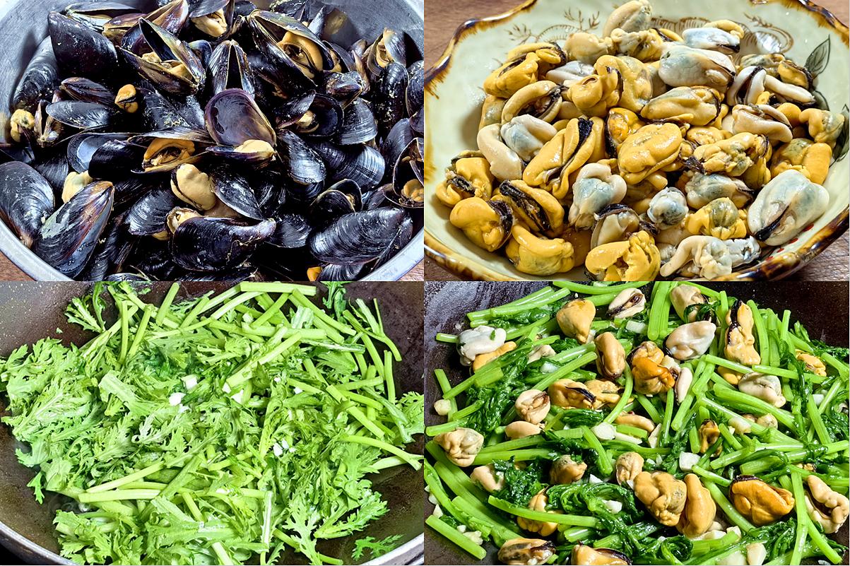 4. 鍋裏再放點油,先下茼蒿梗翻炒半分鐘,再下茼蒿葉;最後倒入炒好的海虹肉,加鹽、少許生抽,快速翻炒均勻即可出鍋。