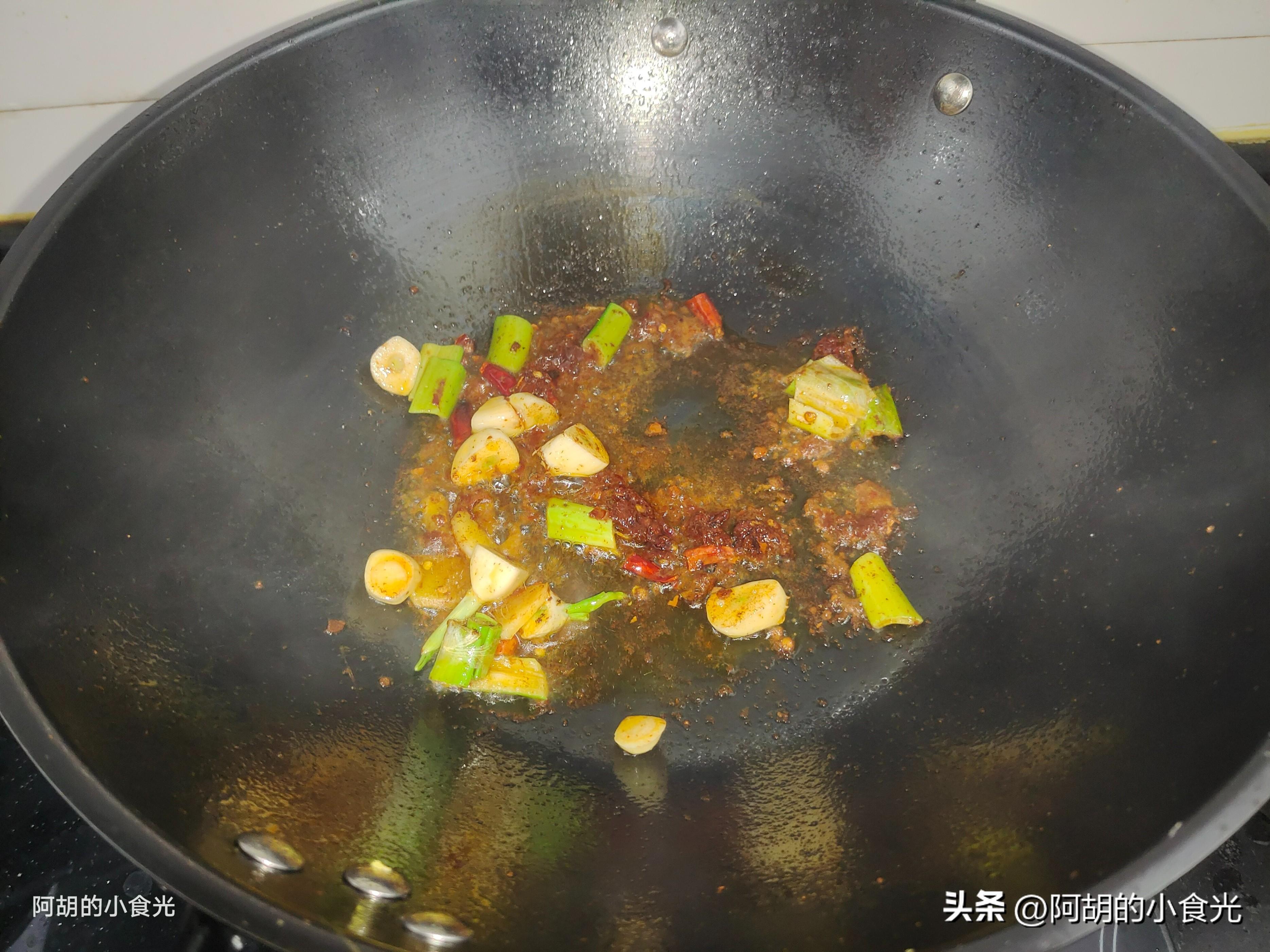 第三步:所有食材和主要調料都備好,下面就可以開火烹飪了。鍋小火烘乾後淋入一些菜籽油燒熱,而後將一湯匙的豆瓣醬倒入鍋中小火炒出香味和紅油,再把蔥薑蒜和幹椒節也倒入鍋中炒出香味。