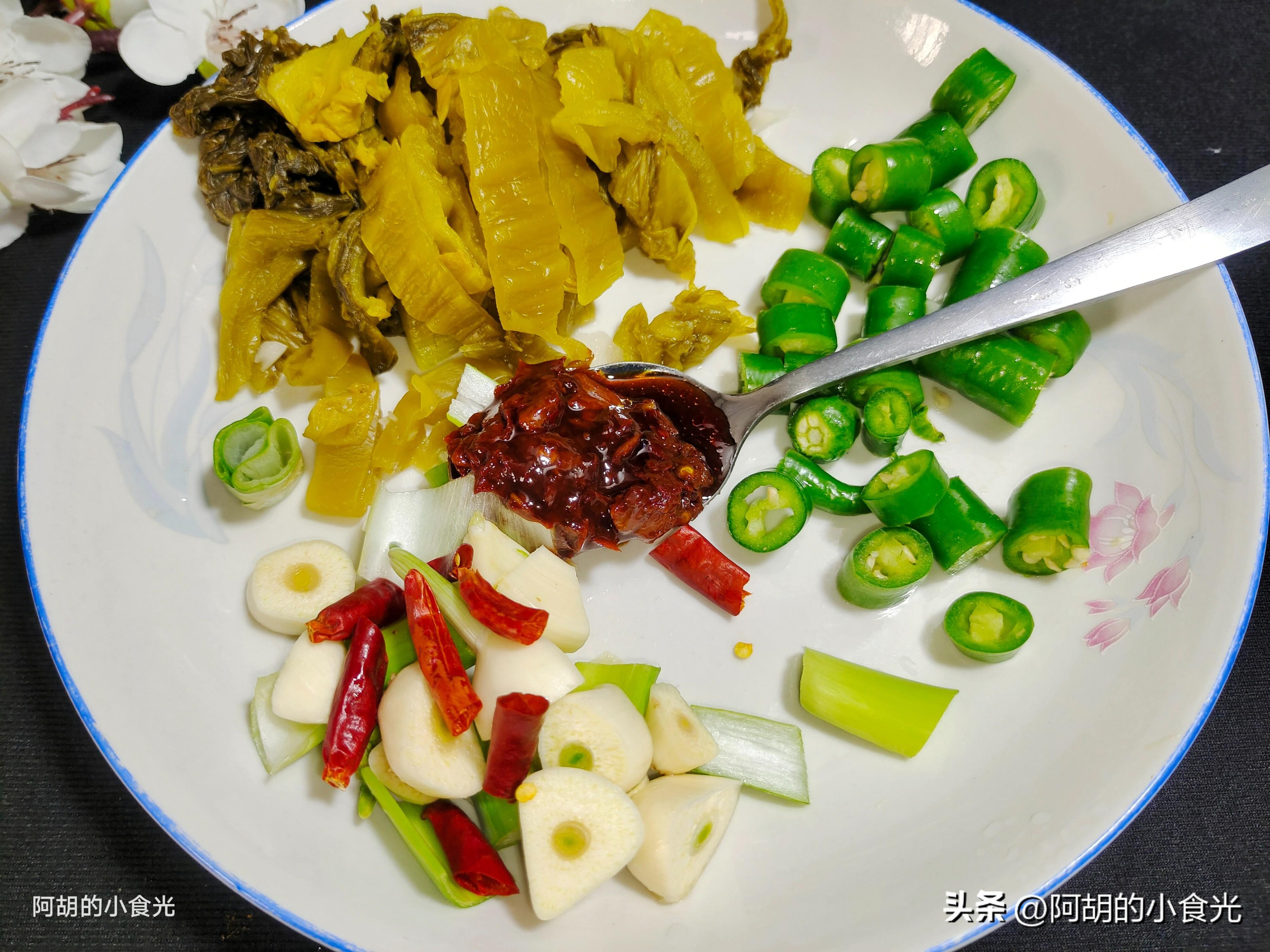 第二步:主要的配菜就是酸菜,這個也是袋裝的酸菜,有一些鹽分需要用清水沖洗掉,擠幹水分後再切碎備用。再來一些蔥薑蒜和幹辣椒節作爲小料,一些青椒切小圈備用,喜歡辣一些的可以搭配幾個紅小米椒切圈。還有一湯匙的郫縣豆瓣醬也要備好。