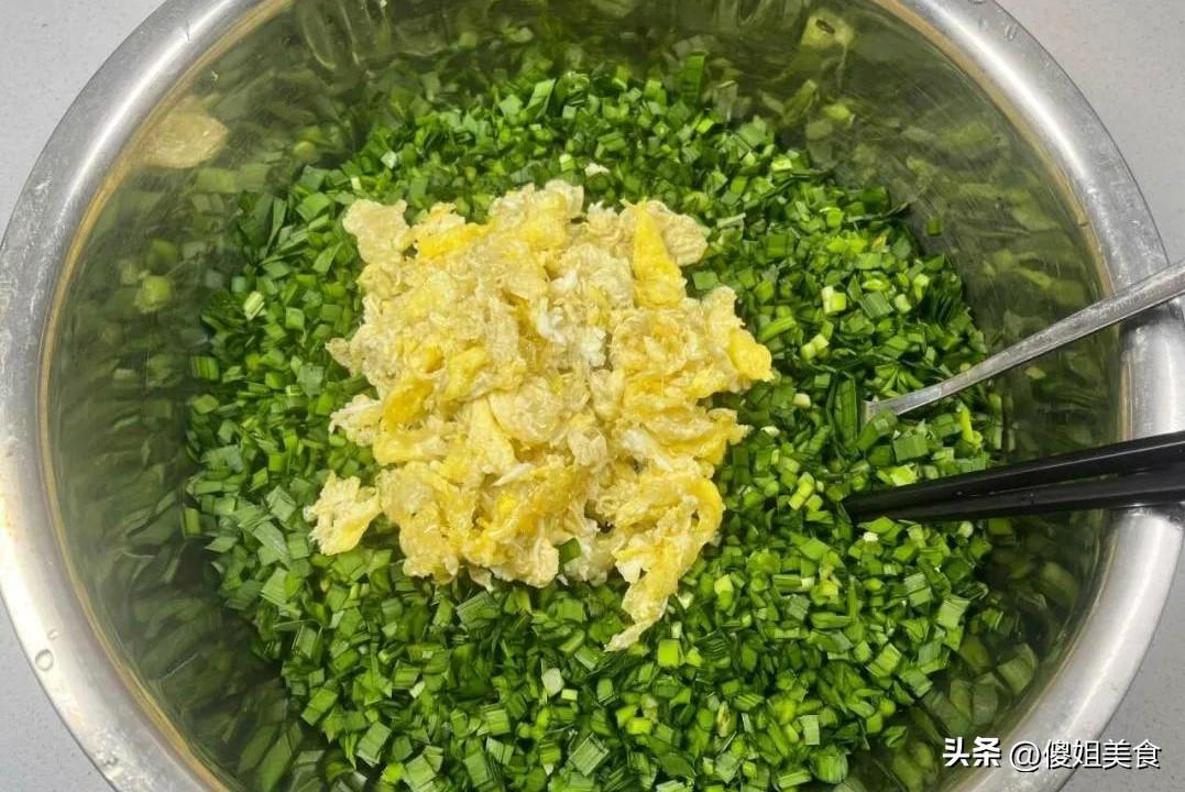【具體做法】1、韭菜洗乾淨後甩幹水分,切成細細的碎末,放進大碗裏。接着把雞蛋打散,鍋裏放油,燒熱後倒入蛋液,用筷子快速劃拉成雞蛋碎,這樣拌餡最香。等雞蛋放涼後和韭菜匯合,加一勺蠔油、適量鹽(別太鹹)、幾滴香油,輕輕攪拌均勻,餡料就準備好了。