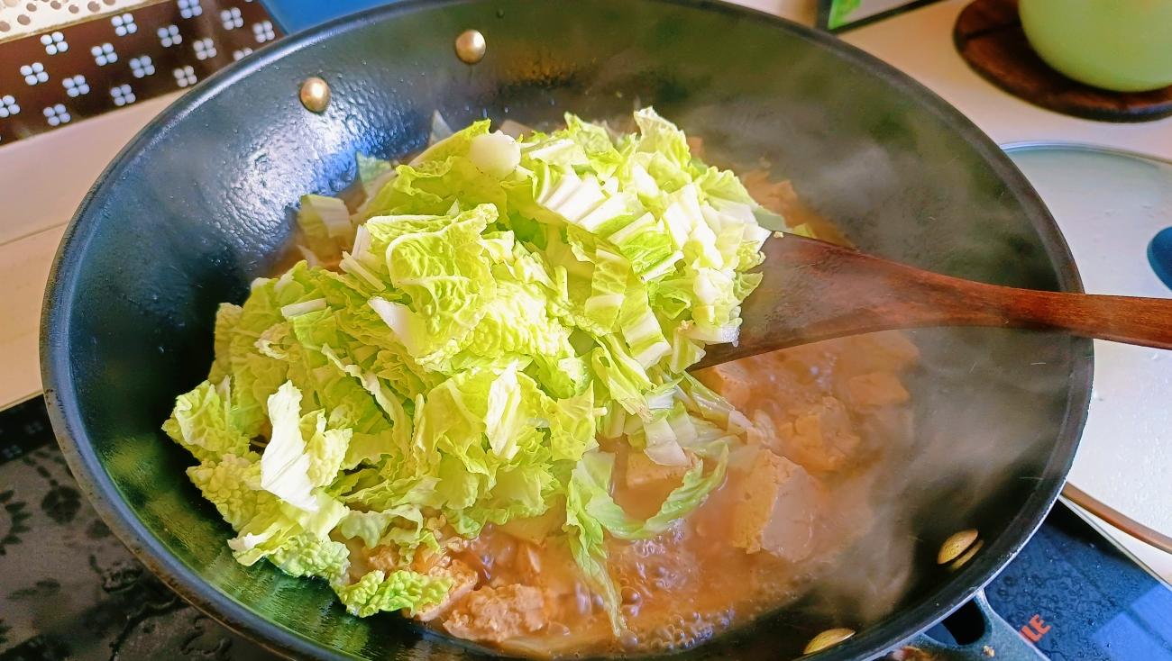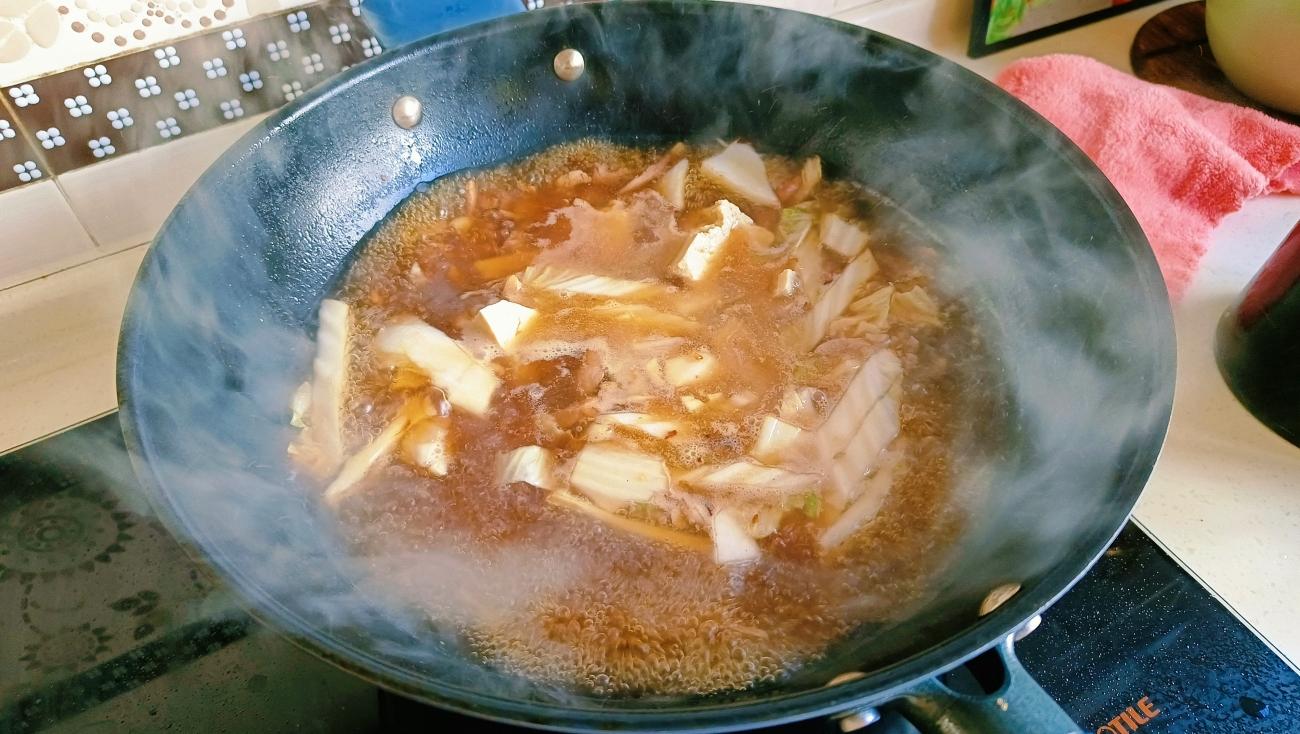 然後調味加湯:淋入生抽2勺、老抽半勺、蠔油1勺、翻炒均勻,讓白菜幫裹滿醬汁,再加入足量的熱水(用熱水燉菜不柴,而且粉條也不容易坨),大火燒開後再將豆腐放入,輕輕攪勻後蓋上鍋蓋,轉小火燉5分鐘。
