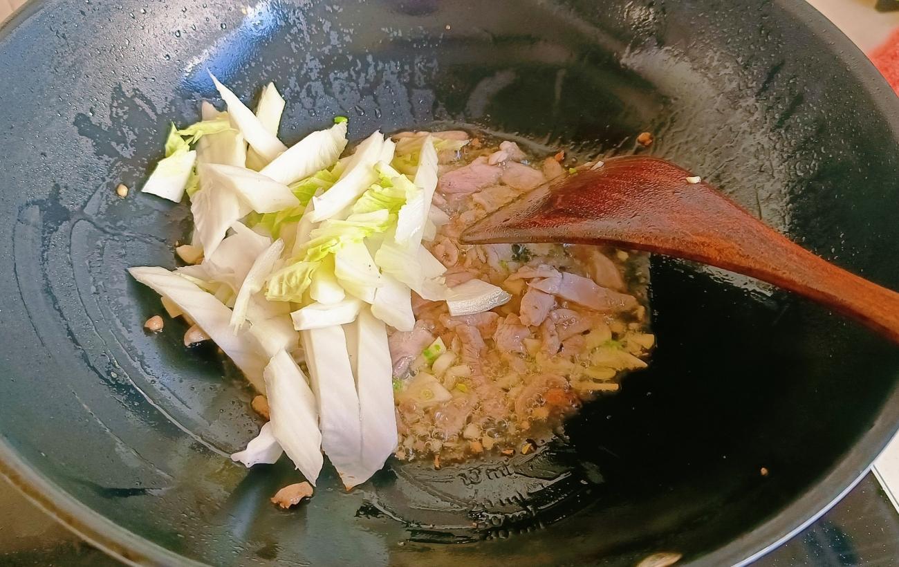 炒出香味後再放入白菜幫,大火快速翻炒,直到白菜幫顏色變透明,這一步可以減輕白菜的澀味,喫着更清甜。
