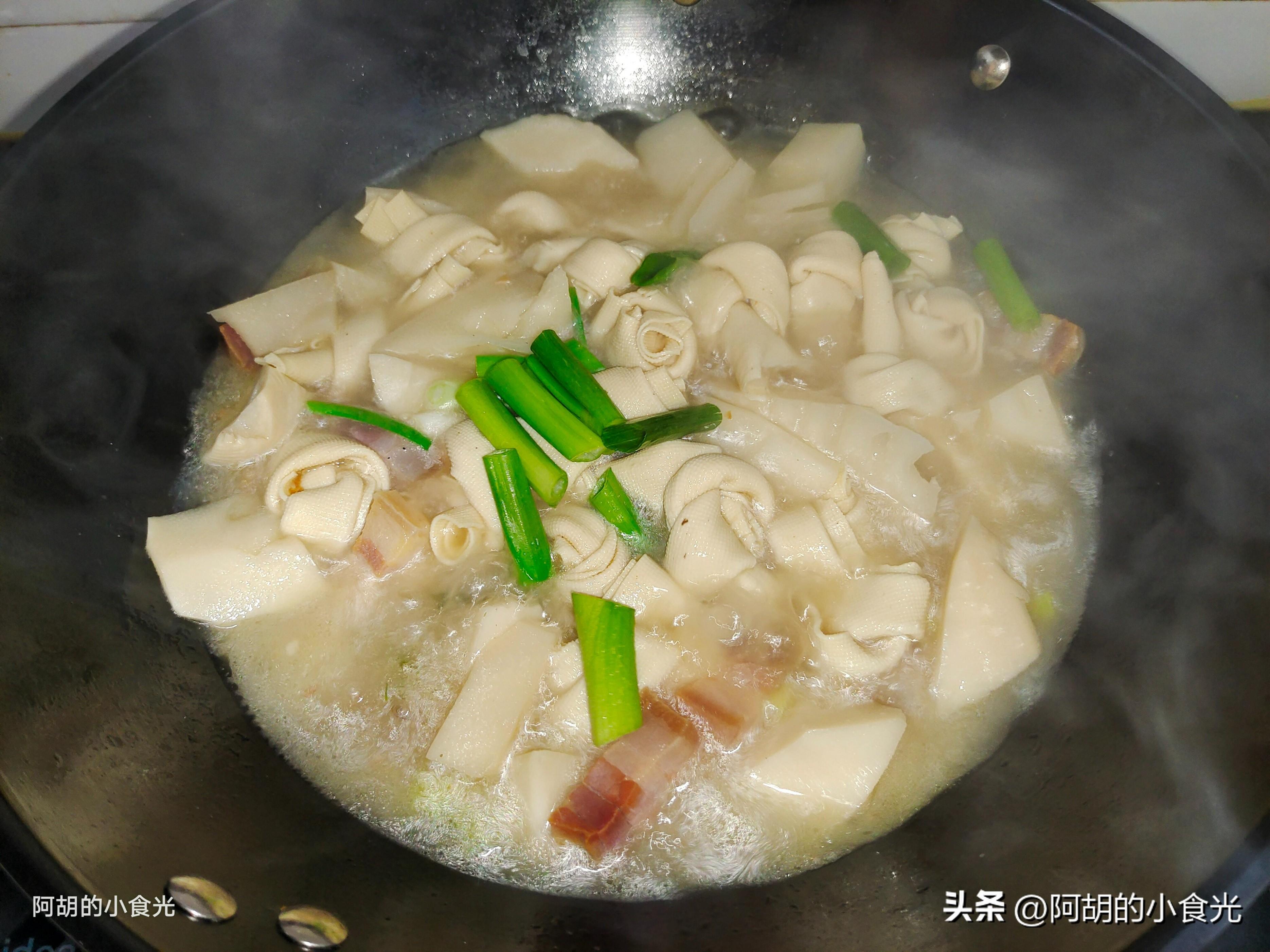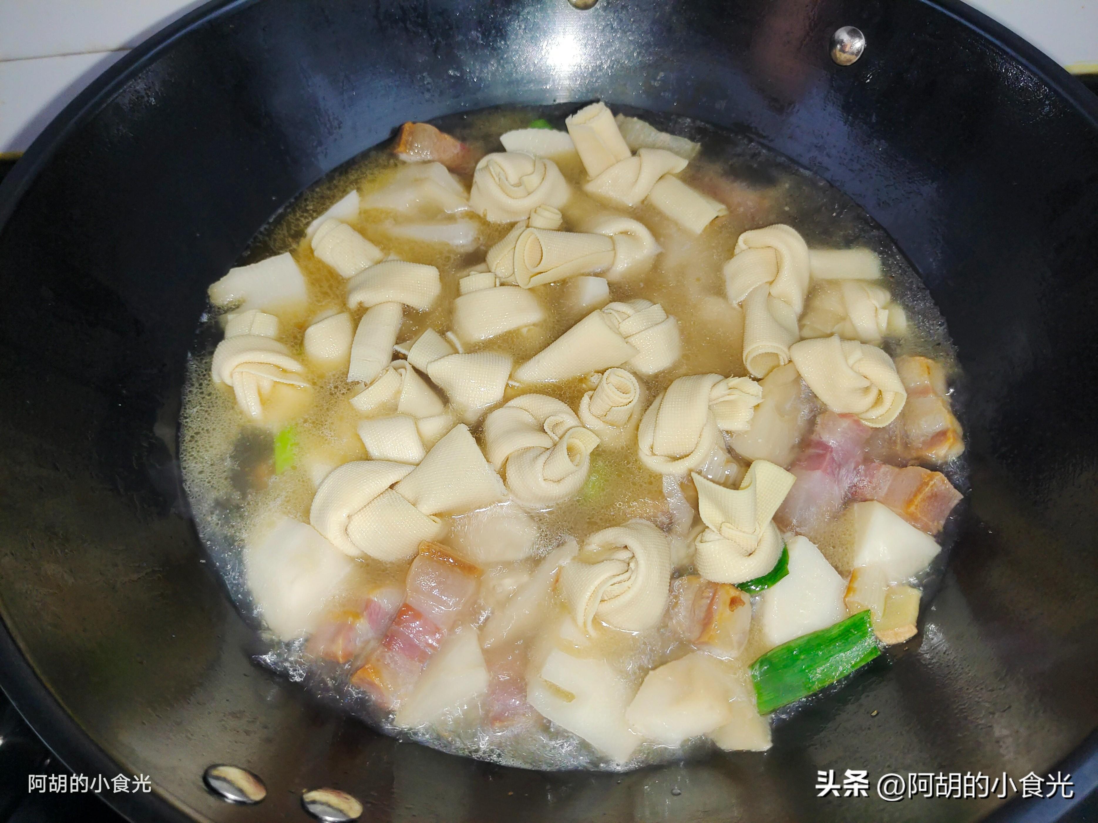第六步:調味就不用加鹽了,就來一些白胡椒粉即可,喜歡的也可以適當撒入少許的雞精提鮮。再撒入一把蔥綠,簡單翻拌幾下後就可以出鍋裝盤了。調味很簡單,看似比較清淡,實則味道很是鮮美的一個做法,這都是鹹肉塊和冬筍的功勞,尤其是湯水更甚。軟嫩的千張結也是入味至極,好喫好做又好喝,感興趣的一定要試一試這個做法。