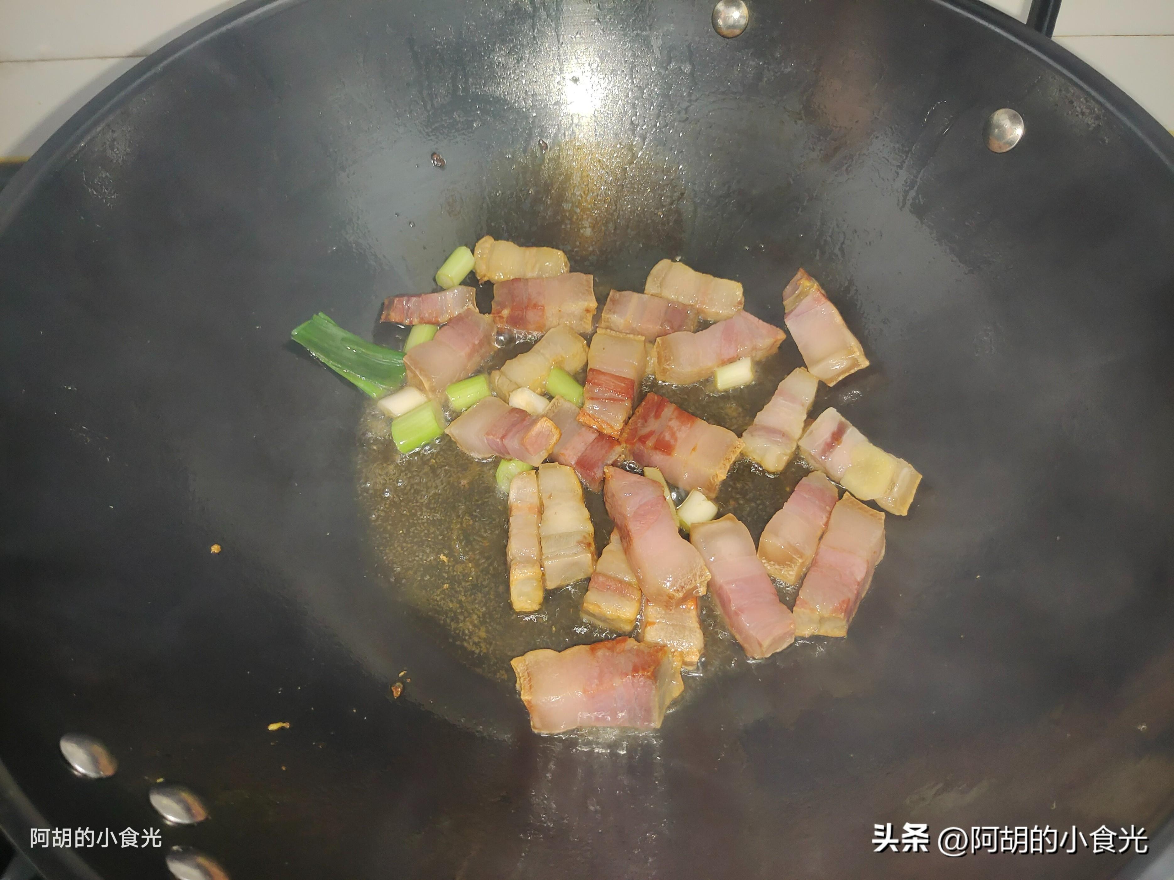 第四步:所有食材都已備好就可以開火烹飪了。鍋小火烘乾後淋入一些花生油燒熱,而後將鹹肉塊倒入鍋中小火煸炒至變色出香味,再把蔥姜下鍋炒出香味。