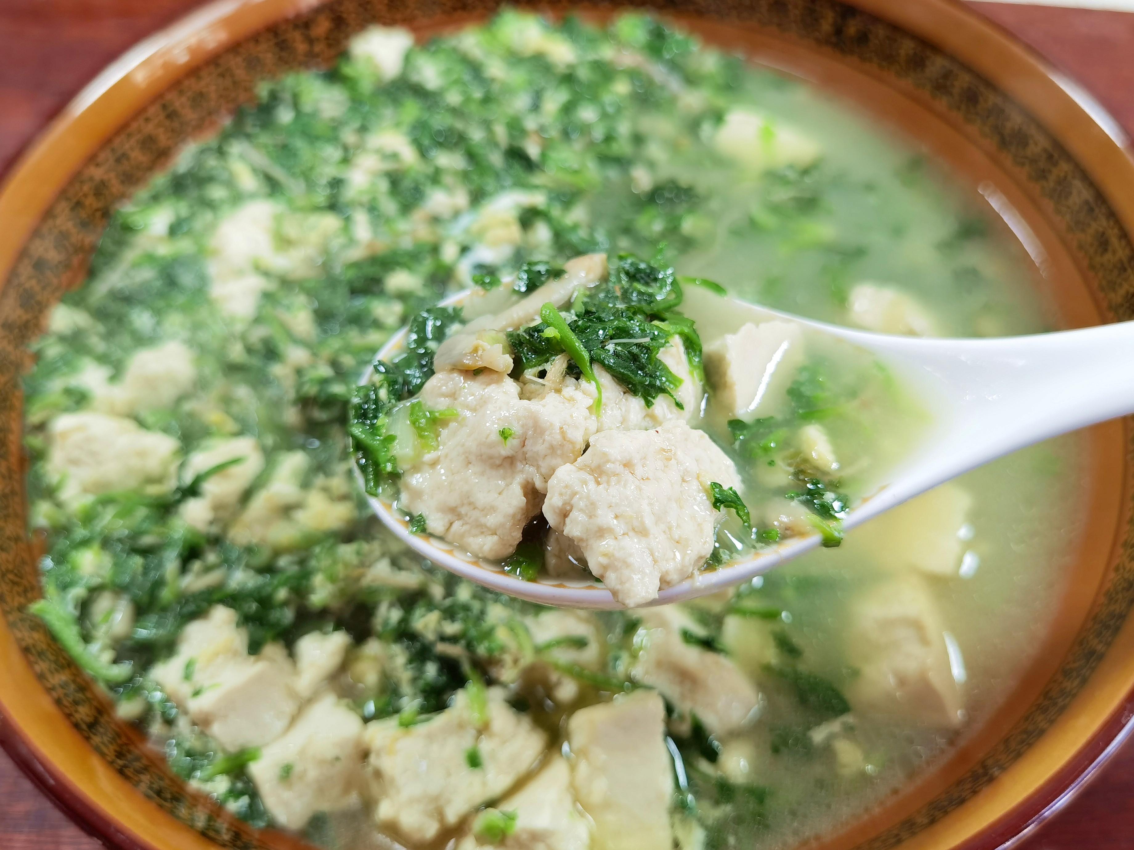 4. 最後放入薺菜碎,加鹽、白胡椒粉調味,再淋上幾滴香油,撒點蔥花就可以出鍋了。