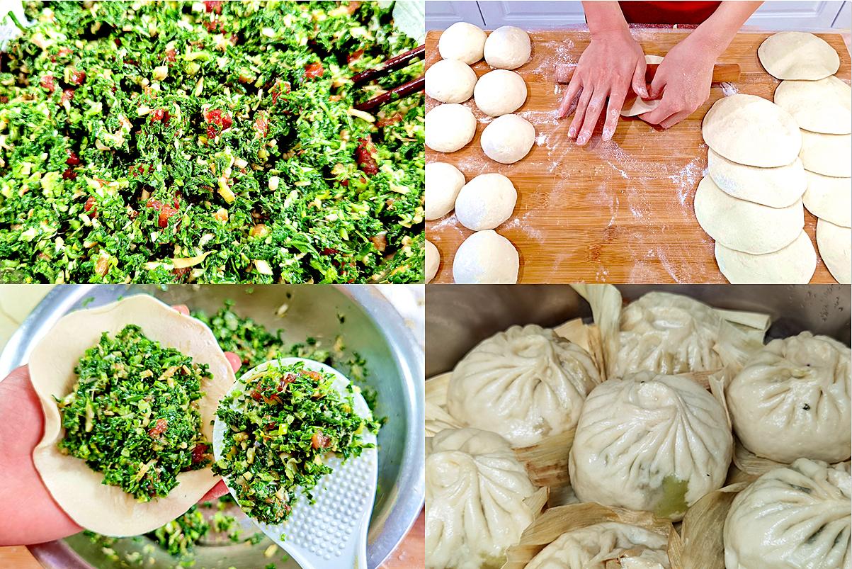 4. 發酵好的麪糰揉搓排氣,分成小劑子,擀成中間厚邊緣薄的皮。包入餡料,捏成包子,放在蒸屜上二次醒發15-20分鐘。水開後上鍋,大火蒸15分鐘,關火後燜3分鐘再開蓋。