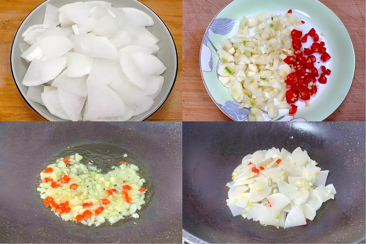 3. 鍋燒熱,倒比平時炒菜稍多的油。先放一半的蒜末和小米辣,小火炸到金黃,香味四溢。轉大火,立刻倒入蘿蔔片,快速翻炒。