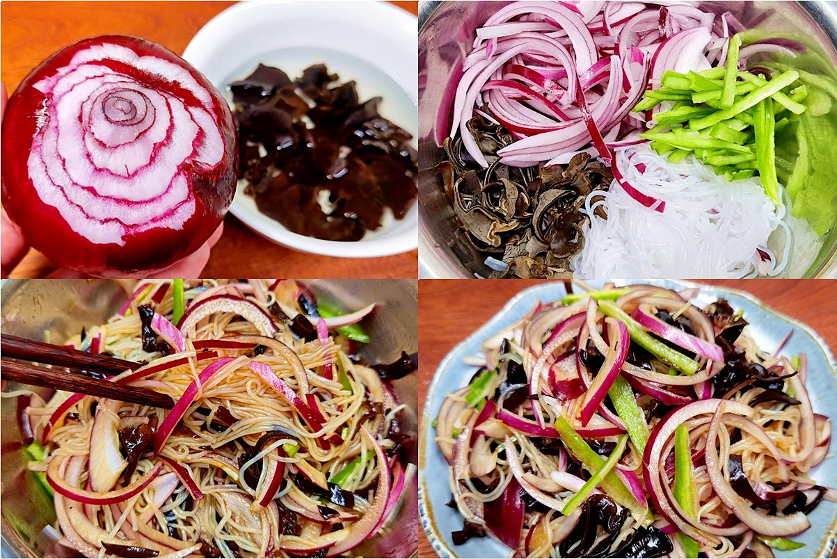 食材:紫皮洋蔥半個,青椒一個,龍口粉絲一小把,幹黑木耳一小撮,香菜,熟白芝麻。調料需要生抽、香醋、鹽、糖、香油、辣椒油。