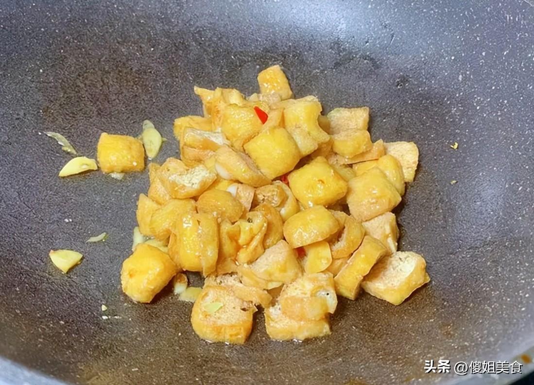 2、 鍋燒熱,倒油,油溫上來後先把蒜末和小米辣圈倒進去,香味瞬間就被激發出來了,聞着就開胃。先把切好的油豆腐塊倒進去,中火翻炒, 這樣能讓油豆腐的豆香在熱油和蒜辣中被充分激發,表面微微起焦,喫起來會更香。看到油豆腐表面有點微黃了,加入一勺蠔油提鮮,淋上一點味極鮮醬油,快速翻炒均勻,讓每一個油豆腐都先裹上醬汁的味道。這時候,醬汁會瞬間被油豆腐吸收一部分,香氣“噌”一下就上來了。