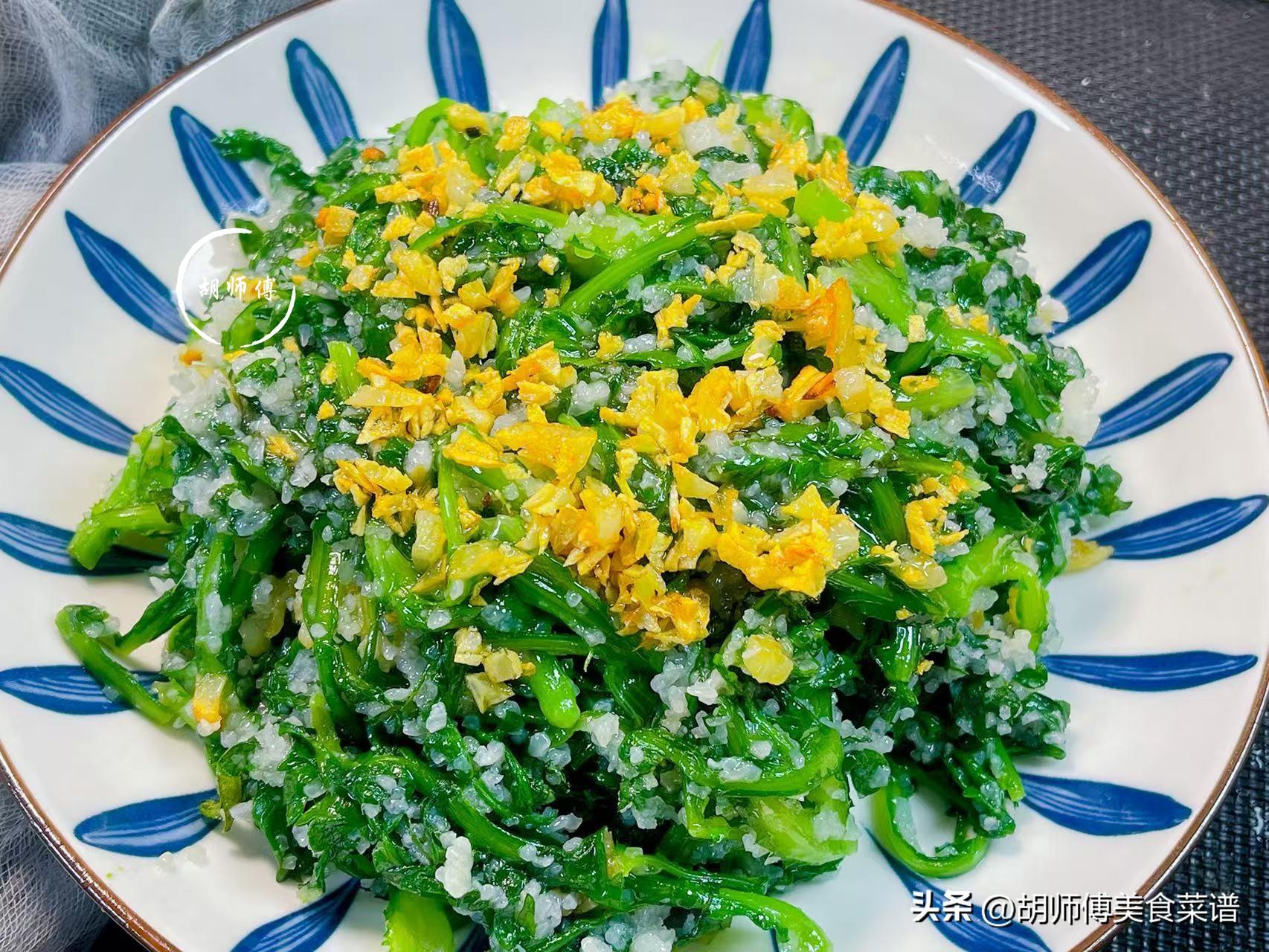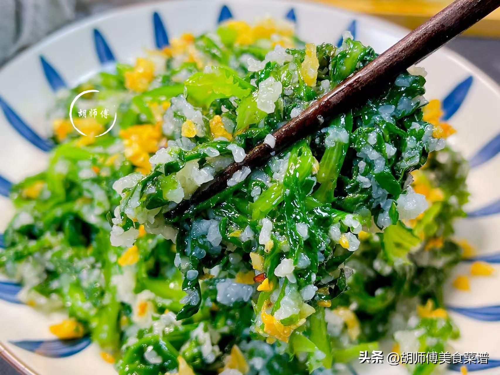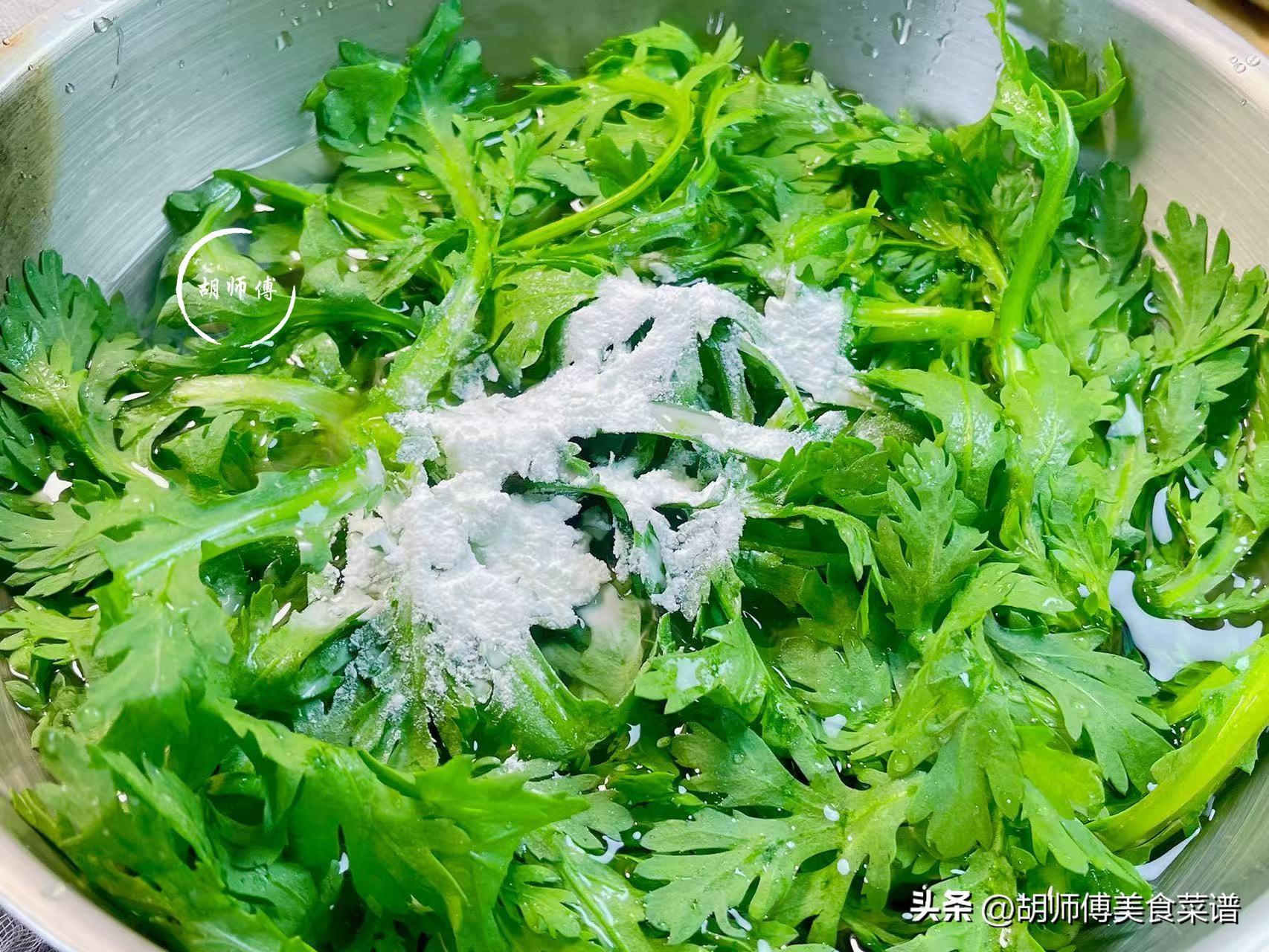 【食材準備】:茼蒿350克、大米粉100克、豬油適量、食鹽、大蒜籽15克。