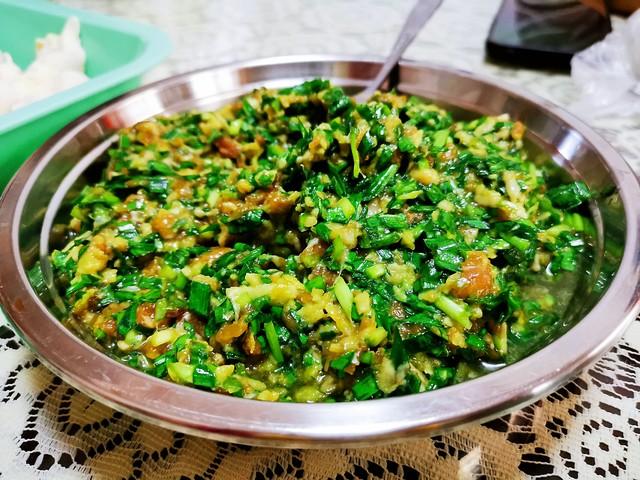- 做法:雞蛋碎、粉條碎、蝦米混合,加花椒油拌勻,最後放韭菜末和鹽(鹽別早放,防韭菜出水),快速拌勻。