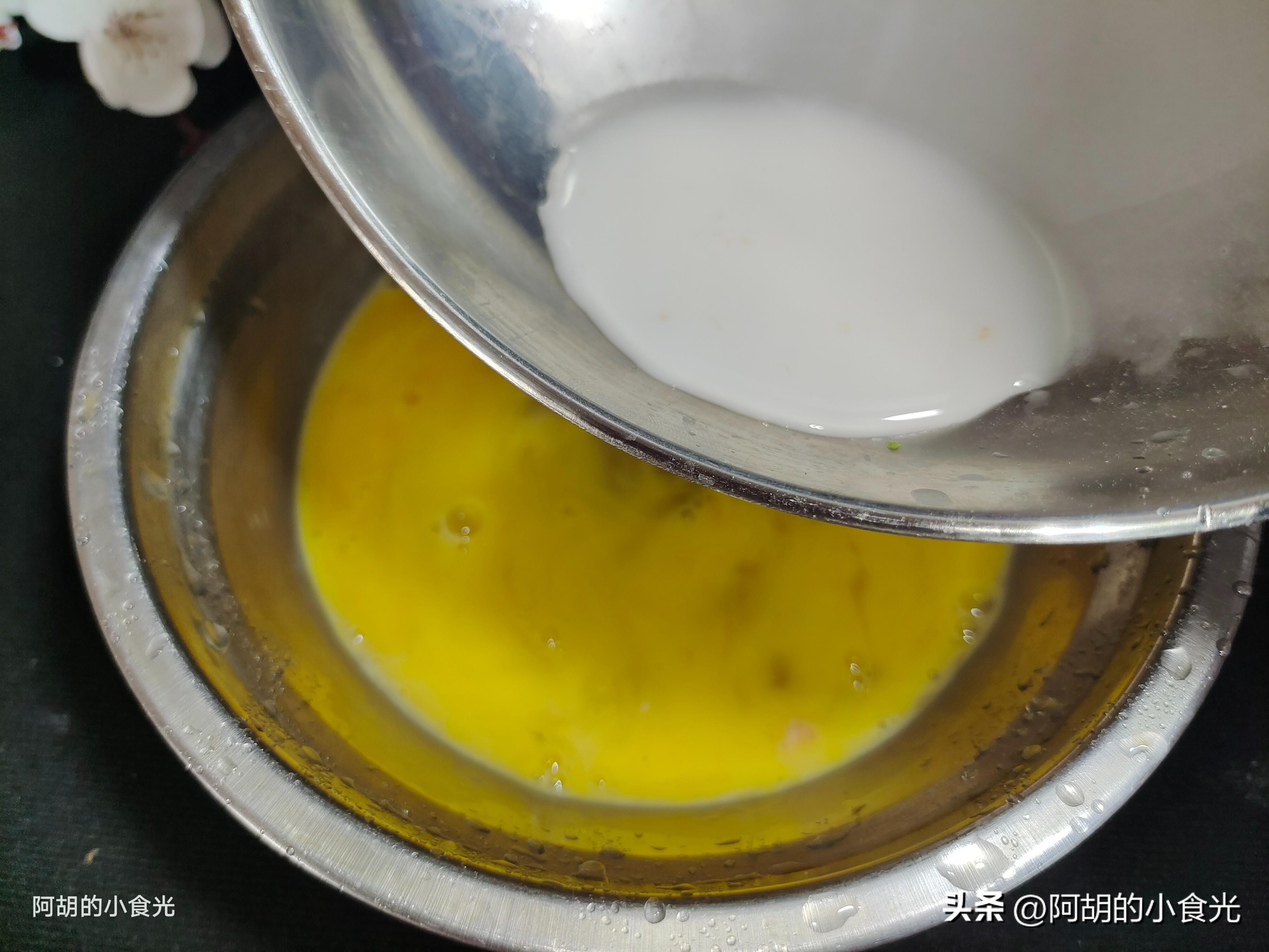 製作蛋餃時,雞蛋液中一定要加入一些很稠的澱粉水攪拌均勻,這樣在澱粉的作用下可以讓蛋餃皮更具一些韌性,煮的時候不容易破碎。注意一定要加入澱粉水而不是幹澱粉,幹澱粉加入蛋液中不容易化開。