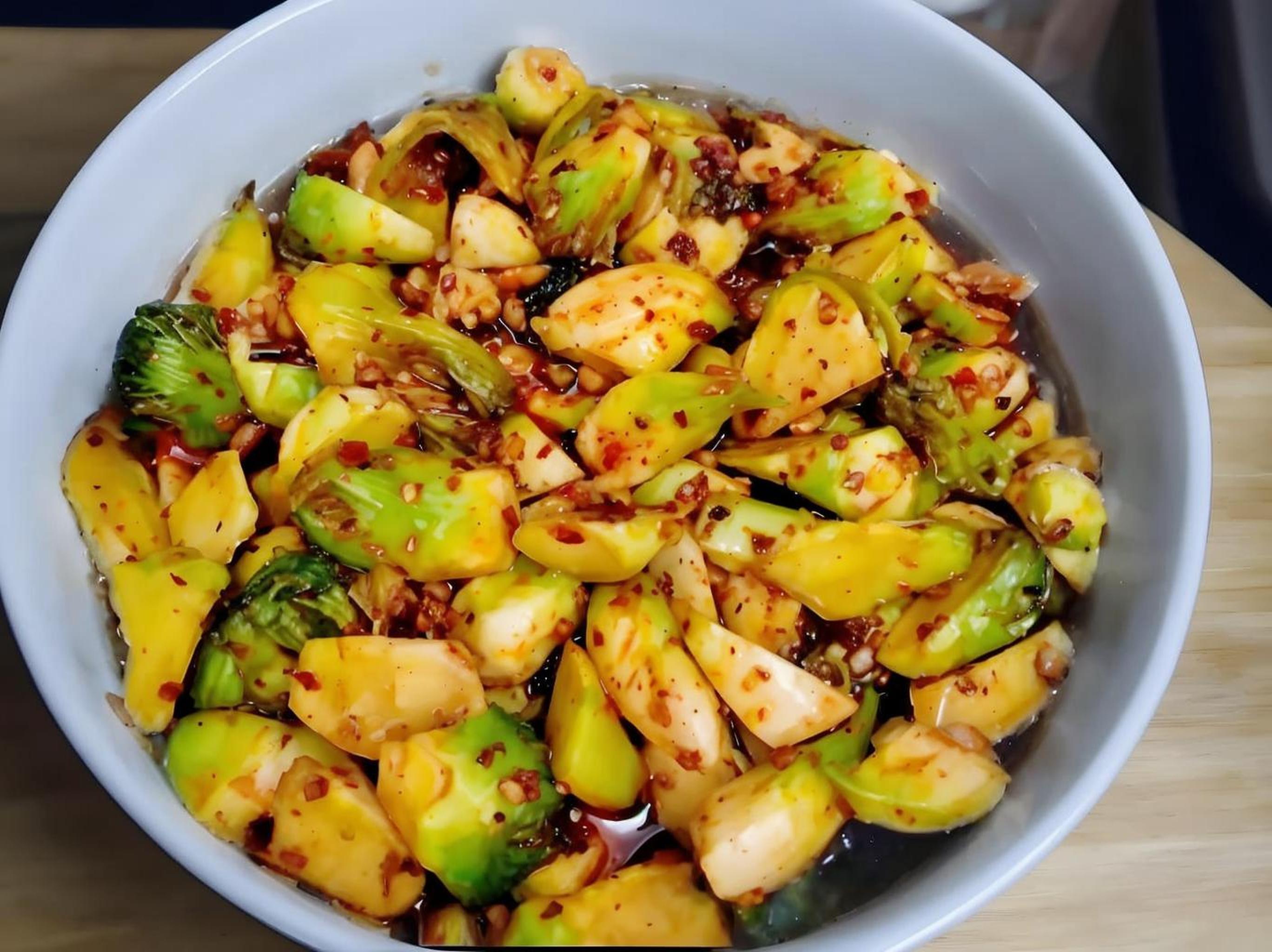 這道小菜那可真是“醒胃神器”!兒菜脆生生的口感完全保留住了,帶着蒜香、辣香和微微的酸鹹,特別開胃。冬天大魚大肉喫多了,來上這麼一小碟,清爽解膩,保準您胃口大開。而且做一次放冰箱能喫兩三天,方便!