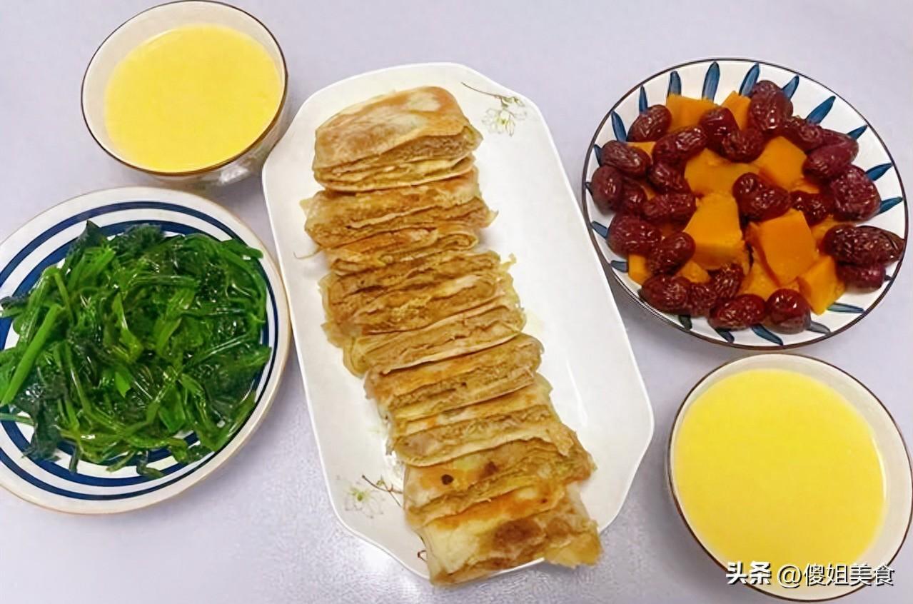 今日早餐菜單:主食:香噴噴的牛肉餅;粥品:香噴噴的玉米麪粥;配菜:清炒菠菜;蒸品:南瓜塊+大棗