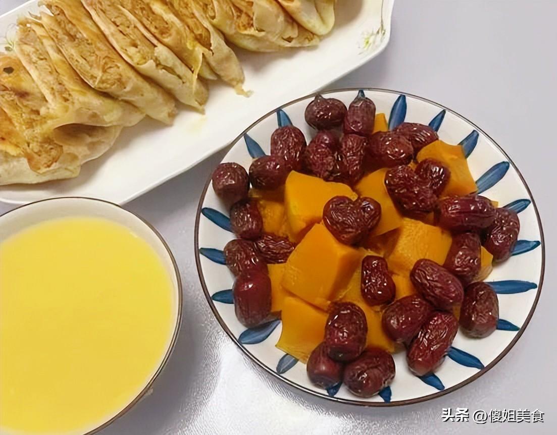 在烙餅的同時,我還熬了一鍋玉米麪粥,玉米麪營養豐富,易消化,喝上一碗暖身又暖胃。熬粥的時候,我會在蒸架上放一盤切好的南瓜塊和一些大棗,一起蒸,這樣一鍋出兩樣,省時又省力。