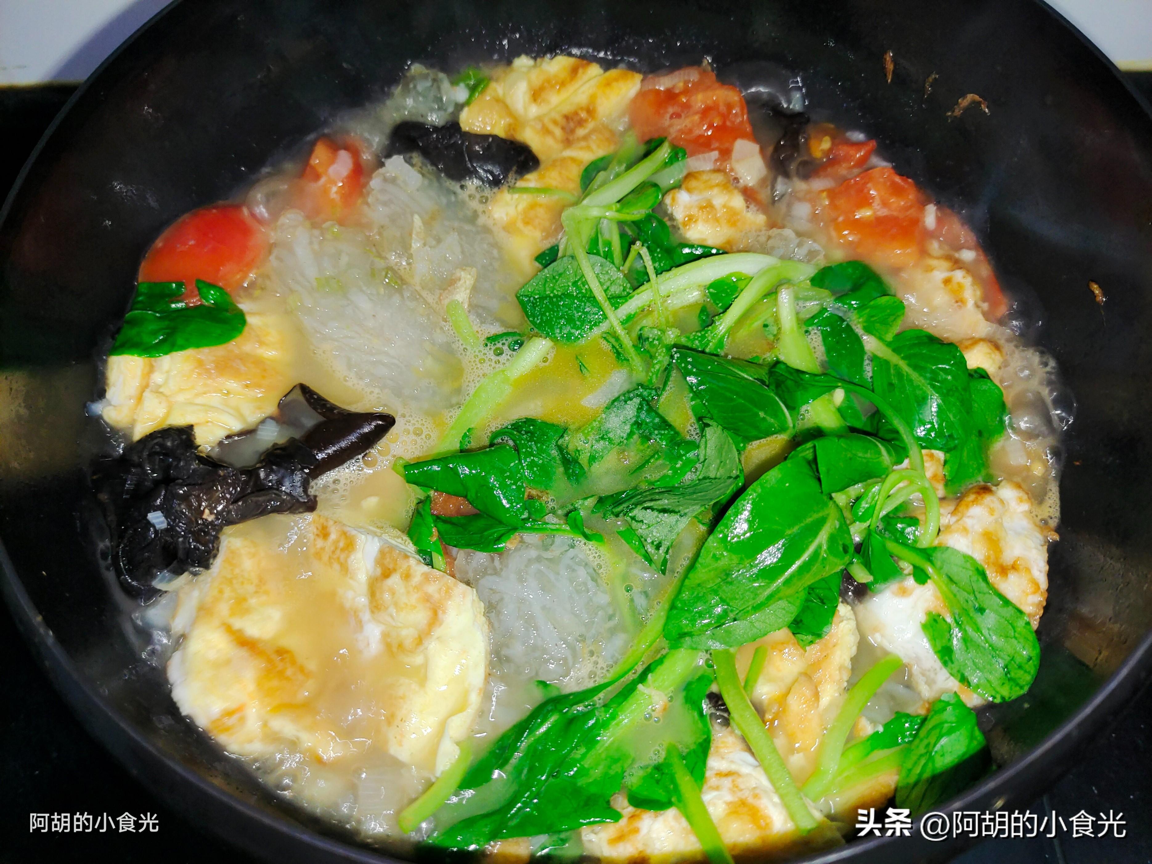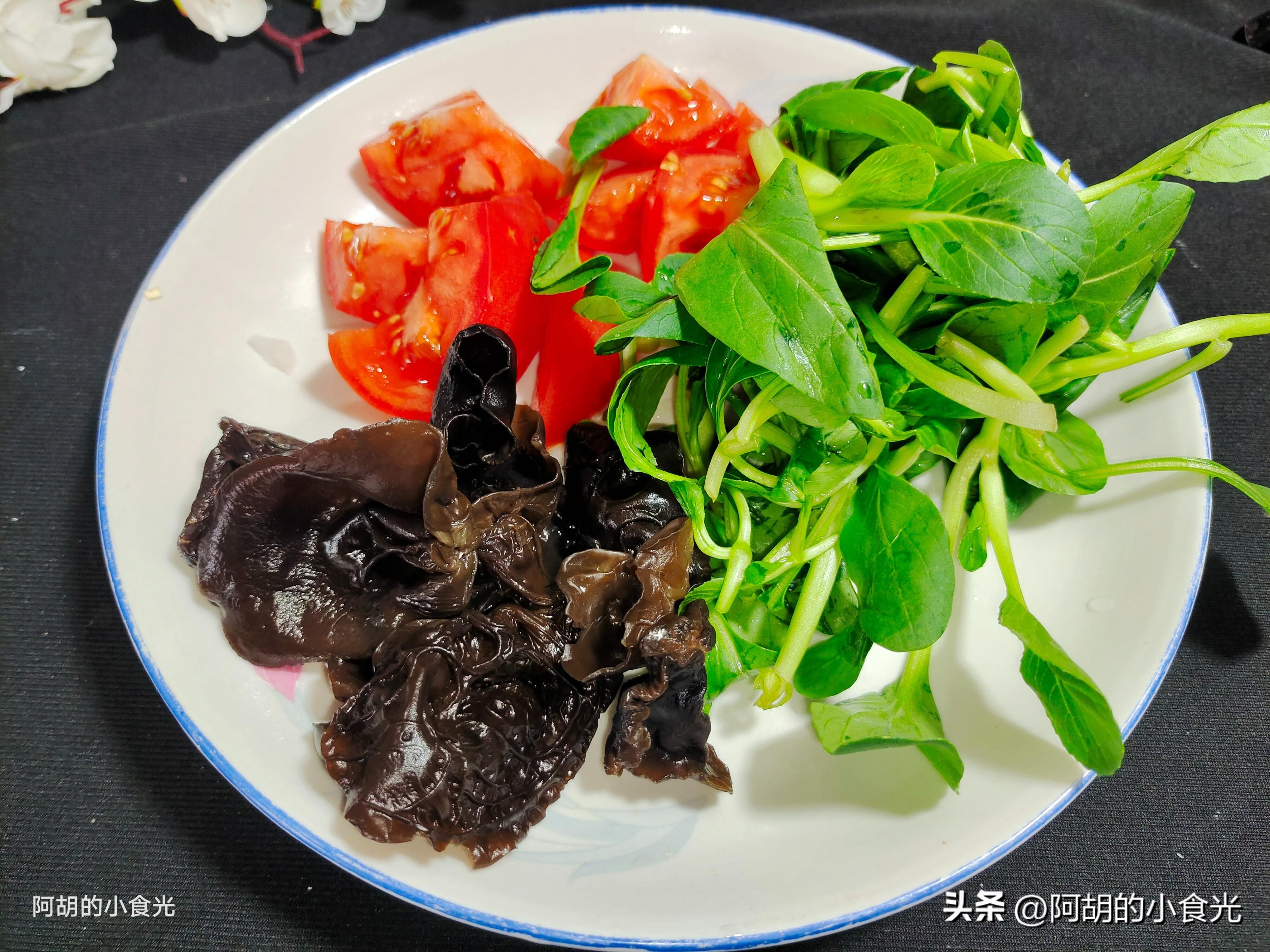 食材準備:白蘿蔔一根,紅薯澱粉適量,西紅柿一個,木耳少許,雞蛋兩個,小青菜適量,蔥薑蒜適量,雞精,食鹽,白胡椒粉適量,菜籽油適量