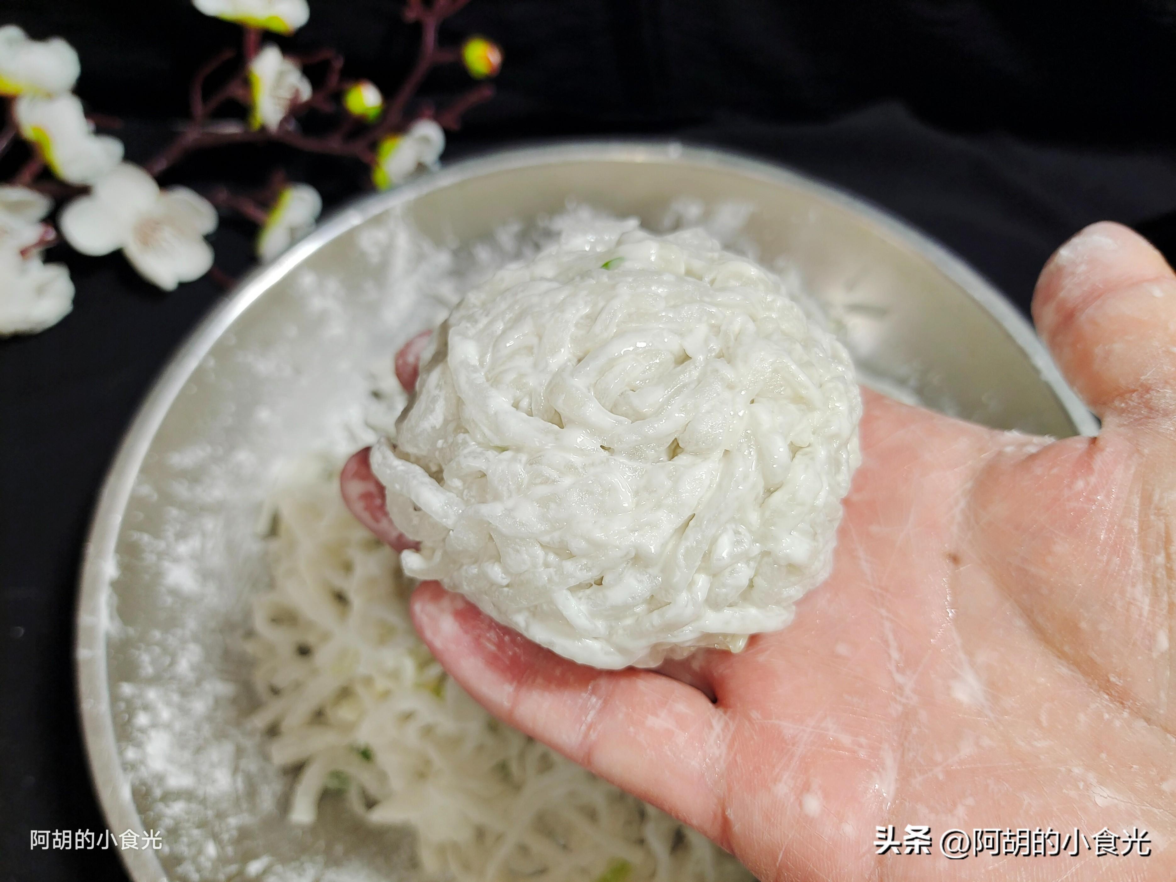 第二步:往蘿蔔絲中撒入一些薑末和蔥花,再少量多次地加入紅薯澱粉,如果那種優質的農家紅薯粉則更好,沒有的就到超市挑選正規包裝的紅薯澱粉即可。要把蘿蔔絲攪拌至根根裹滿澱粉的程度即可。再下手抓起一把拌好的蘿蔔絲,雙手用力地擠壓,將其整理成一個厚厚的圓餅狀態即可。