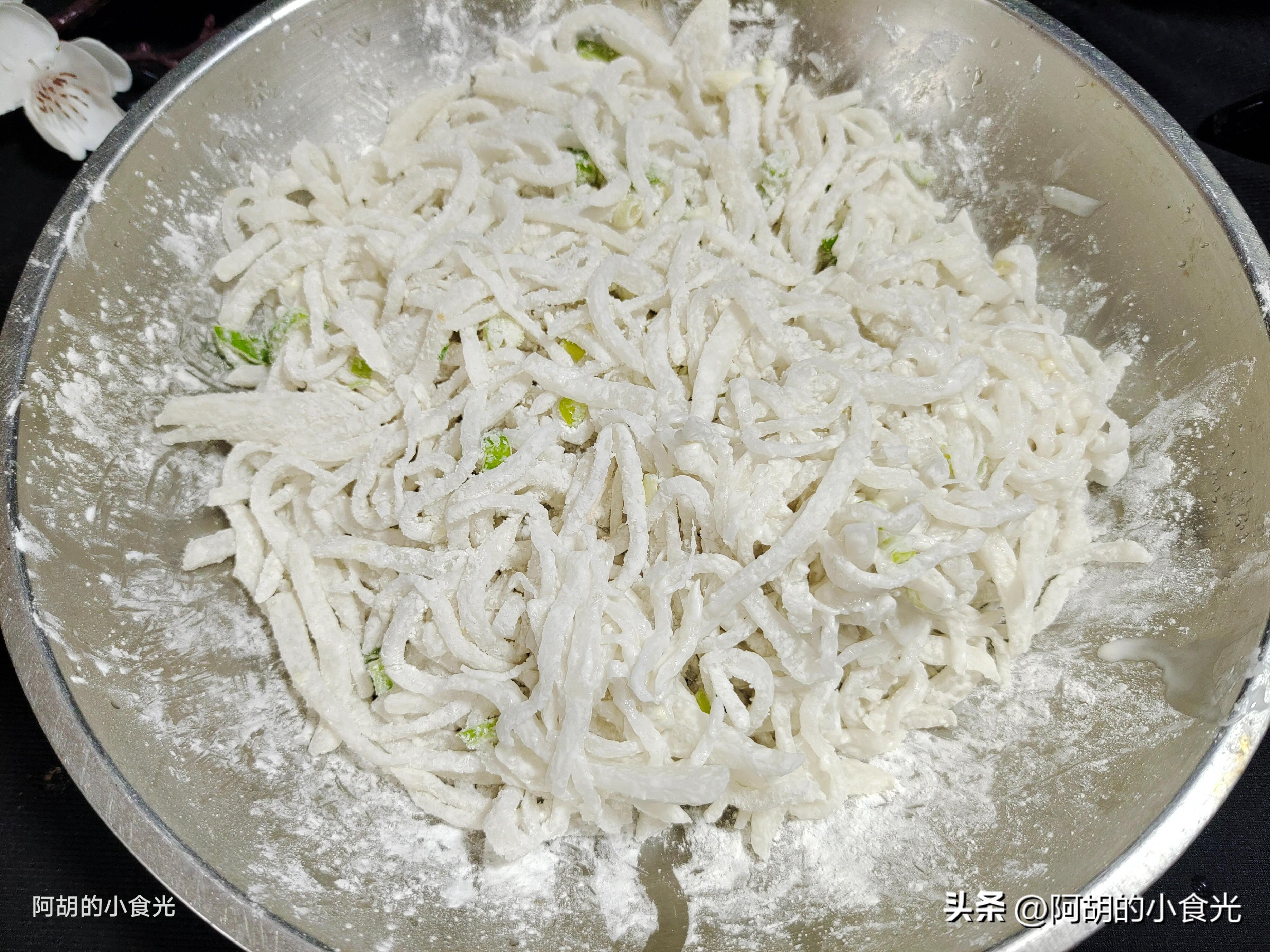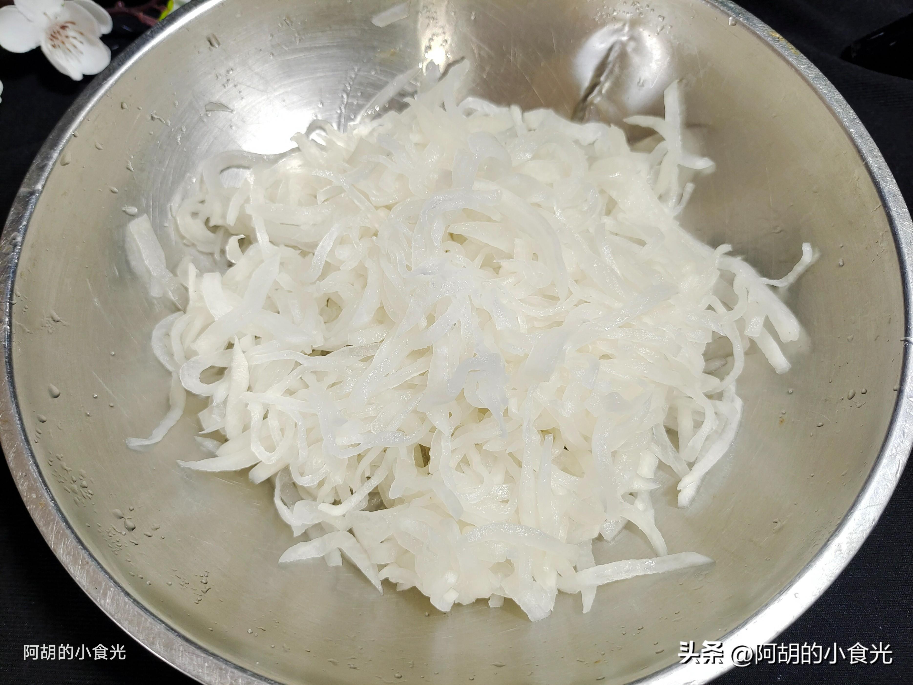 第一步:這道菜的主角是蘿蔔糕,首先就要來製作它。準備白蘿蔔一根,削去外皮後切成細絲放入盆中,也可以用工具擦絲。撒入一把食鹽拌勻醃製半個小時,幫助去除一些水分,醃製好後撈出用力擠幹水分,放入盆中抖散開來待用。