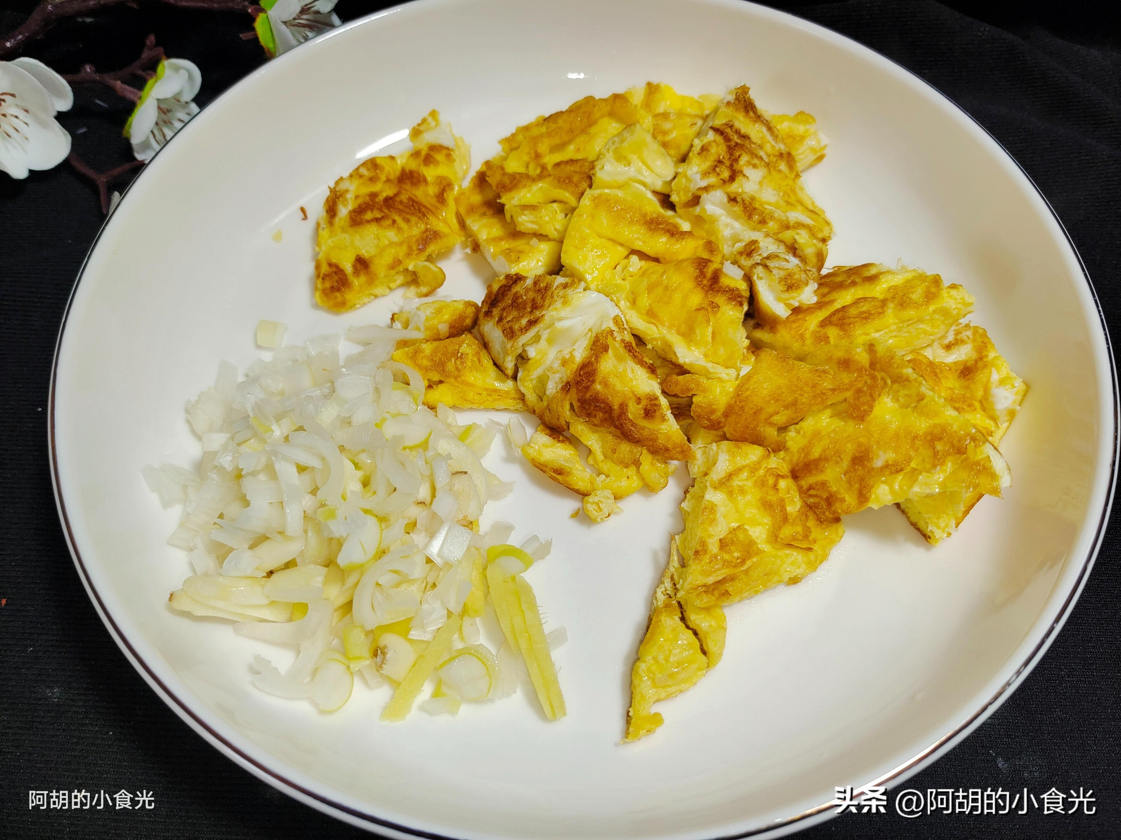 第四步:再準備燒蘿蔔糕的配菜,有西紅柿一個切塊,小青菜一把洗乾淨後備用。兩個雞蛋攪散後攤出來的雞蛋餅切塊,木耳少許泡發後備用,一些蔥薑蒜作爲小料使用。