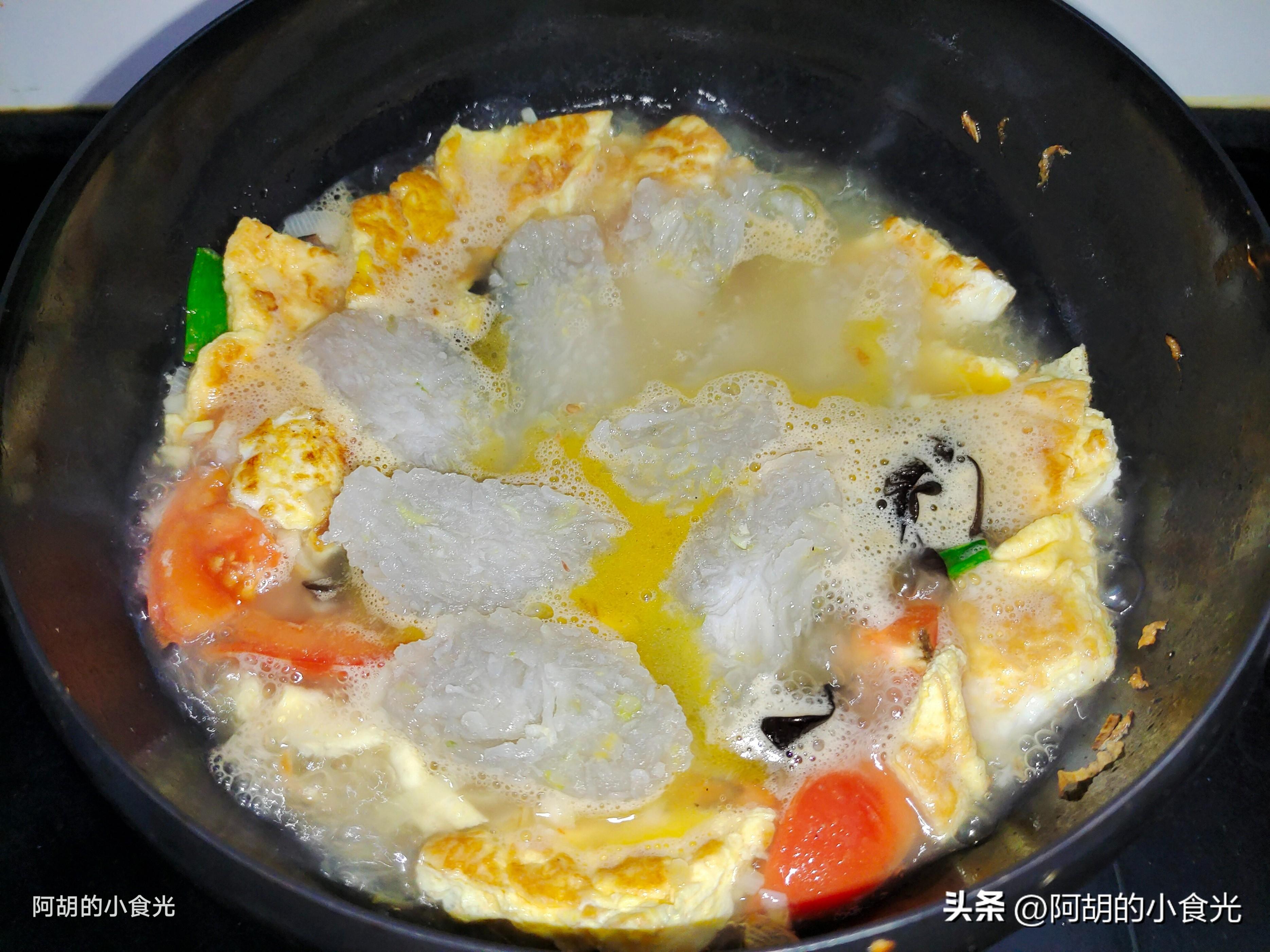 第五步:鍋裏燒菜籽油適量,燒熱後把蔥薑蒜倒入鍋中炒出香味,再把西紅柿塊和雞蛋餅也倒入鍋中,轉爲大火簡單翻炒幾下,準備一些開水直接衝入鍋中,保持大火將其煮開煮沸。再木耳和蘿蔔糕也倒入鍋中,調味就加入一些食鹽、胡椒粉和雞精即可。