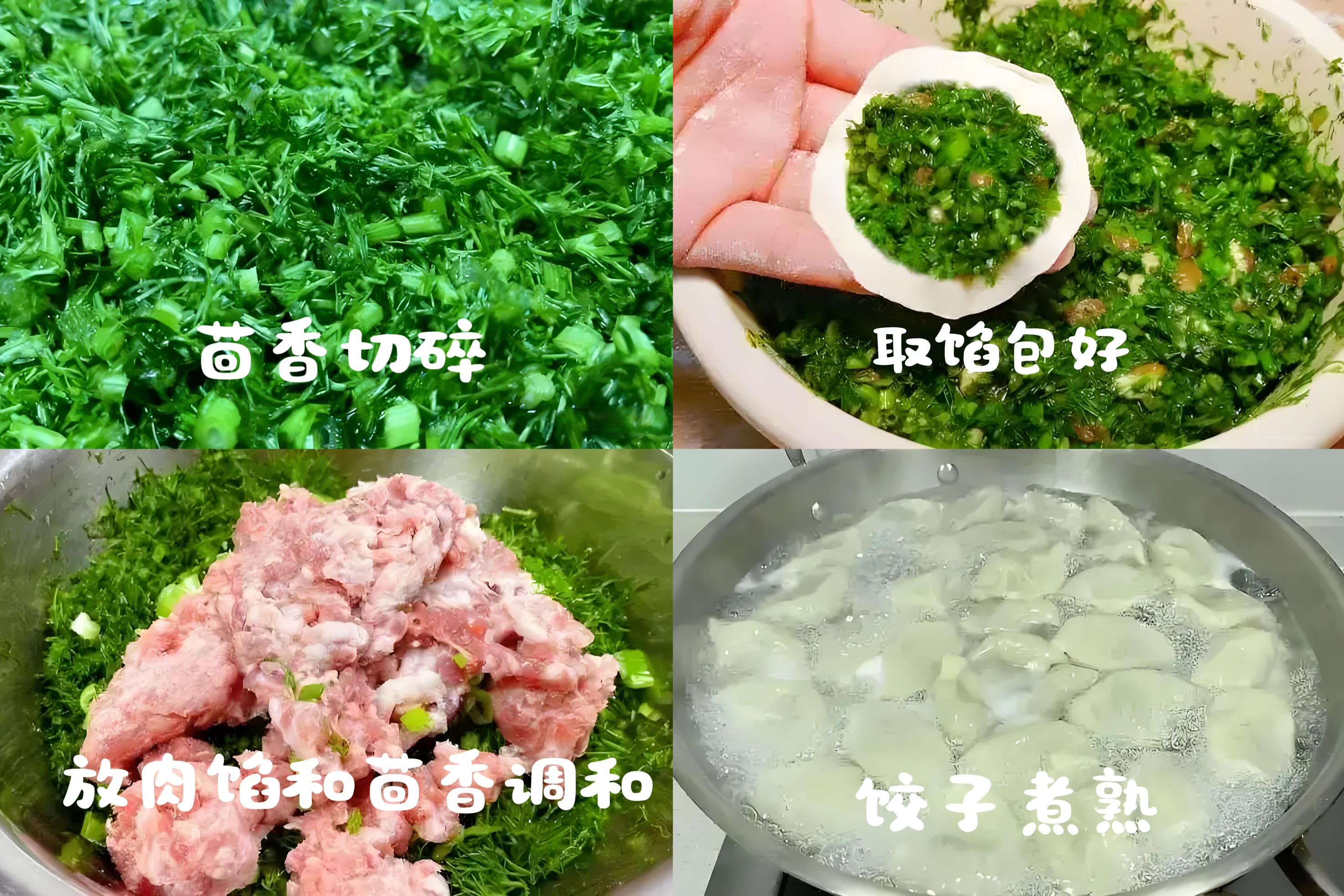1. 茴香菜洗淨,瀝乾水分切碎。豬肉餡選三分肥七分瘦的最好,加入蔥薑末、生抽、老抽、鹽、香油,朝一個方向攪拌上勁。