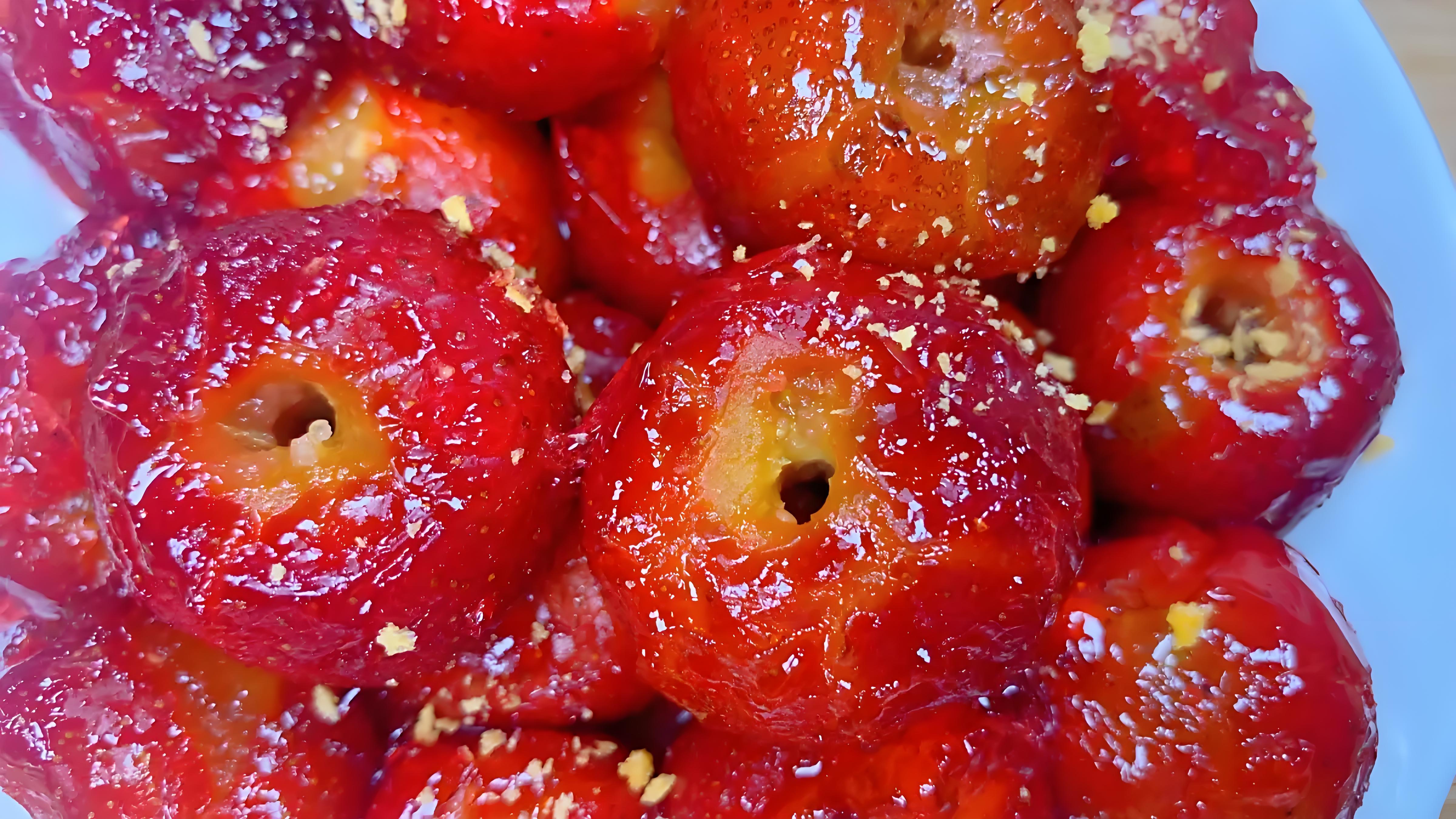4. 關火,將山楂連同糖液一起倒入乾淨容器,晾至微溫或涼透。喫的時候,盛出幾顆到小碟裏,撒上一小撮幹桂花點綴增香。