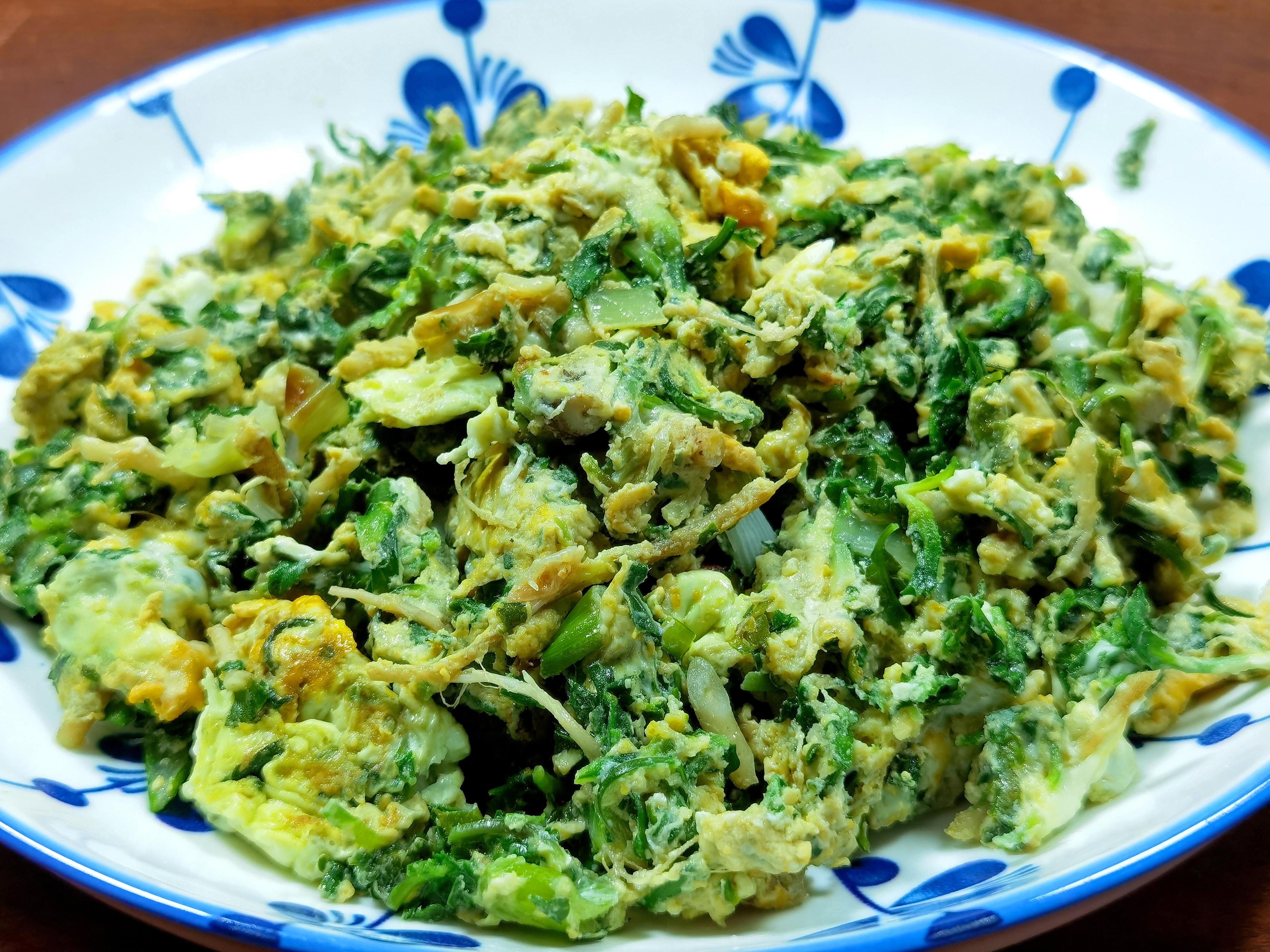 3. 熱鍋熱油,倒入薺菜蛋液,中火煎至底部定型