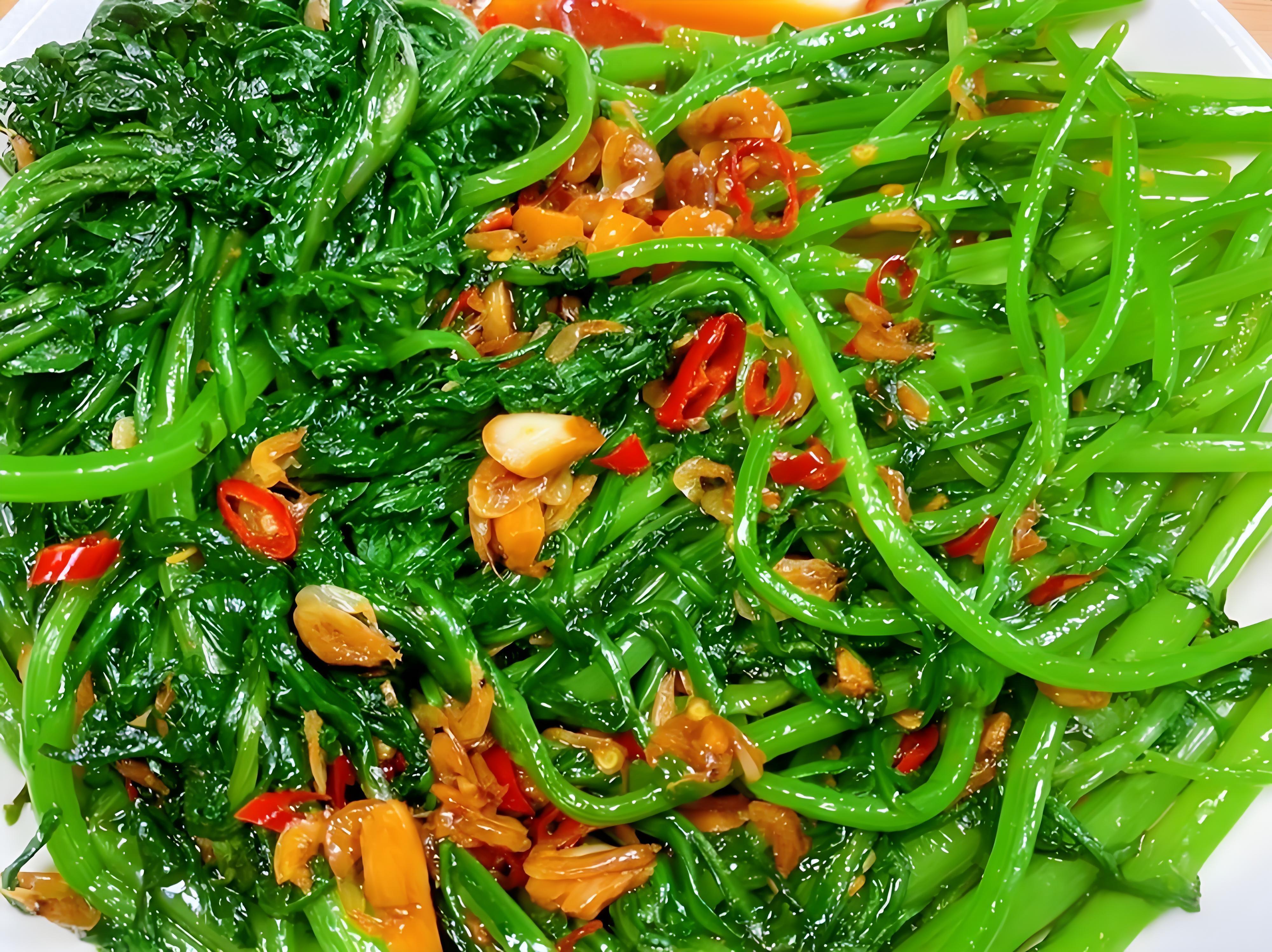 這道菜蒜香撲鼻,小米辣微微的刺激喚醒味蕾,蝦皮帶來海鮮的鹹鮮。茼蒿脆嫩,入口清香回甘,既能疏肝解鬱,又不會過於寒涼,適合全家享用。