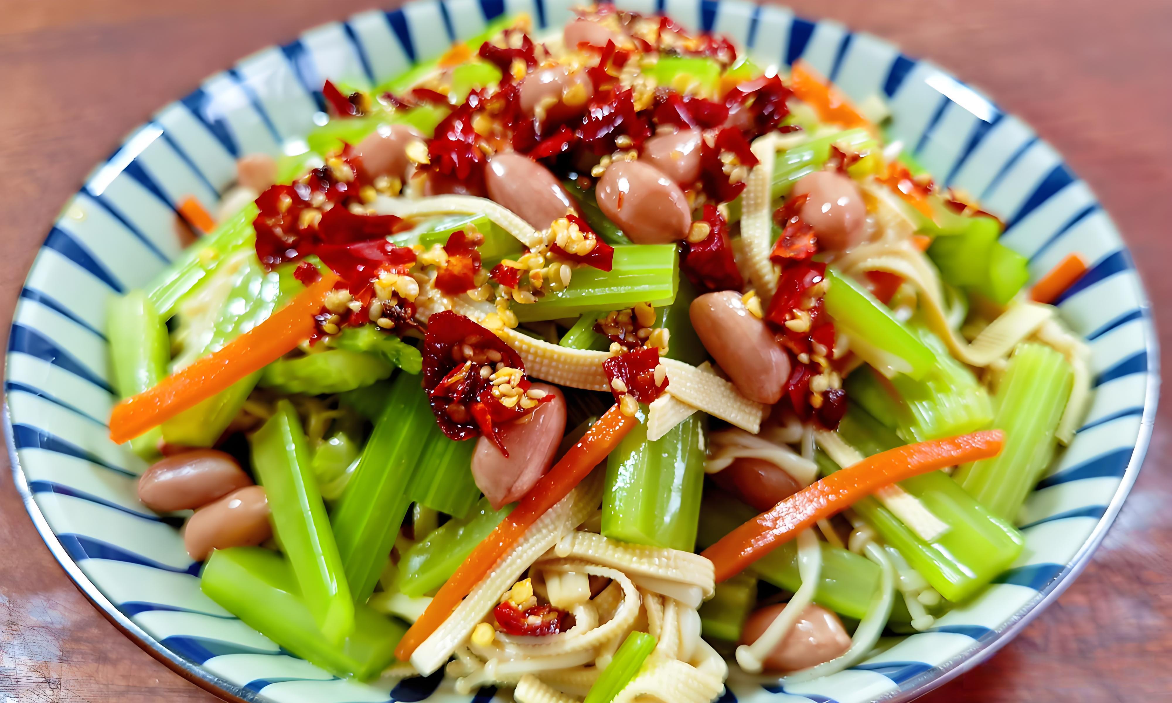 這道涼拌菜色彩豐富,口感層次分明——芹菜的脆、花生的糯、豆皮的韌、胡蘿蔔的甜交織在一起。五香花生增添了風味,免去了炒制的油膩。整道菜清爽開胃,降火不傷胃,適合作爲晚餐的配菜,減輕腸胃負擔,有助於安然入眠。