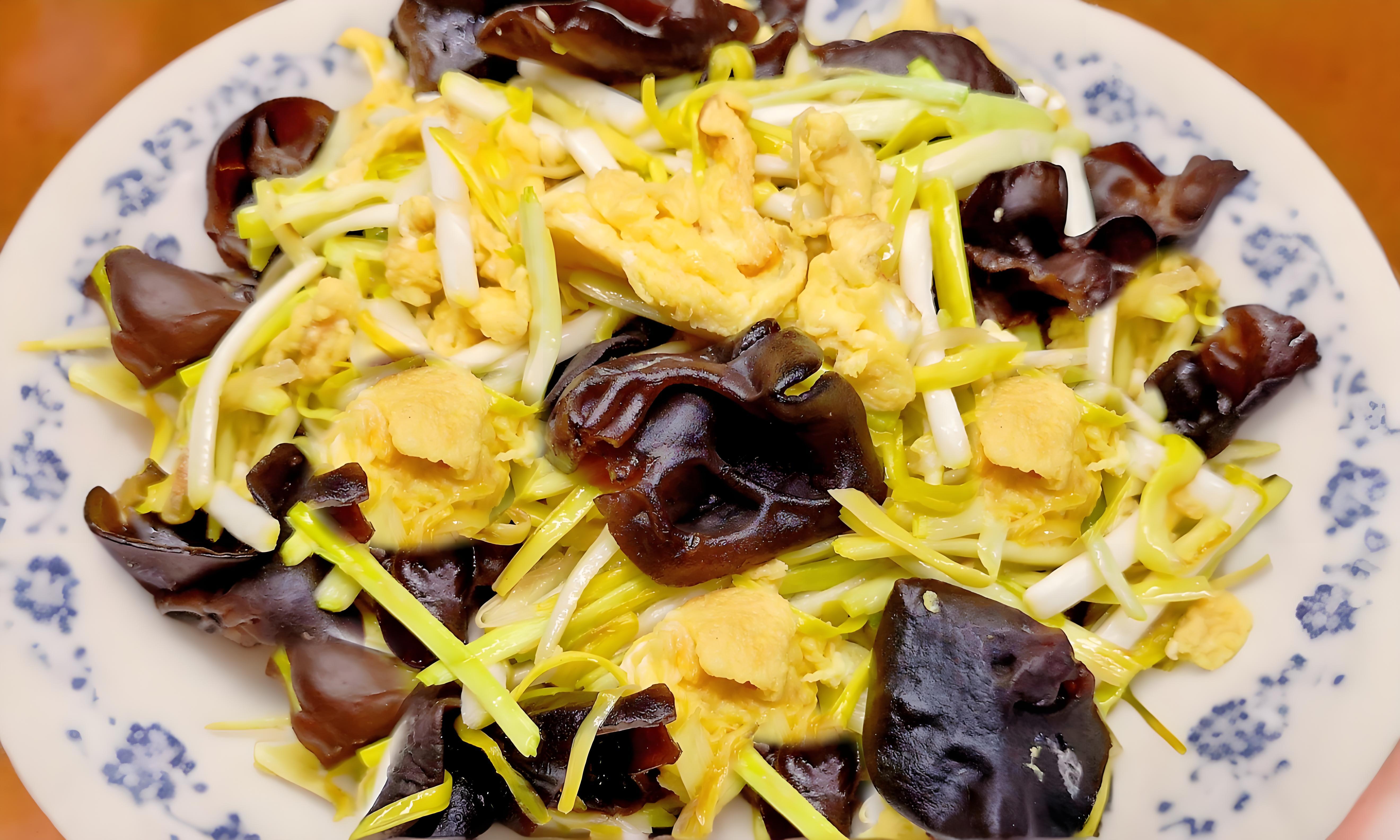 這道家常小炒色彩分明,韭黃的嫩黃、木耳的黑亮、雞蛋的金黃相映成趣,口感層次豐富。
