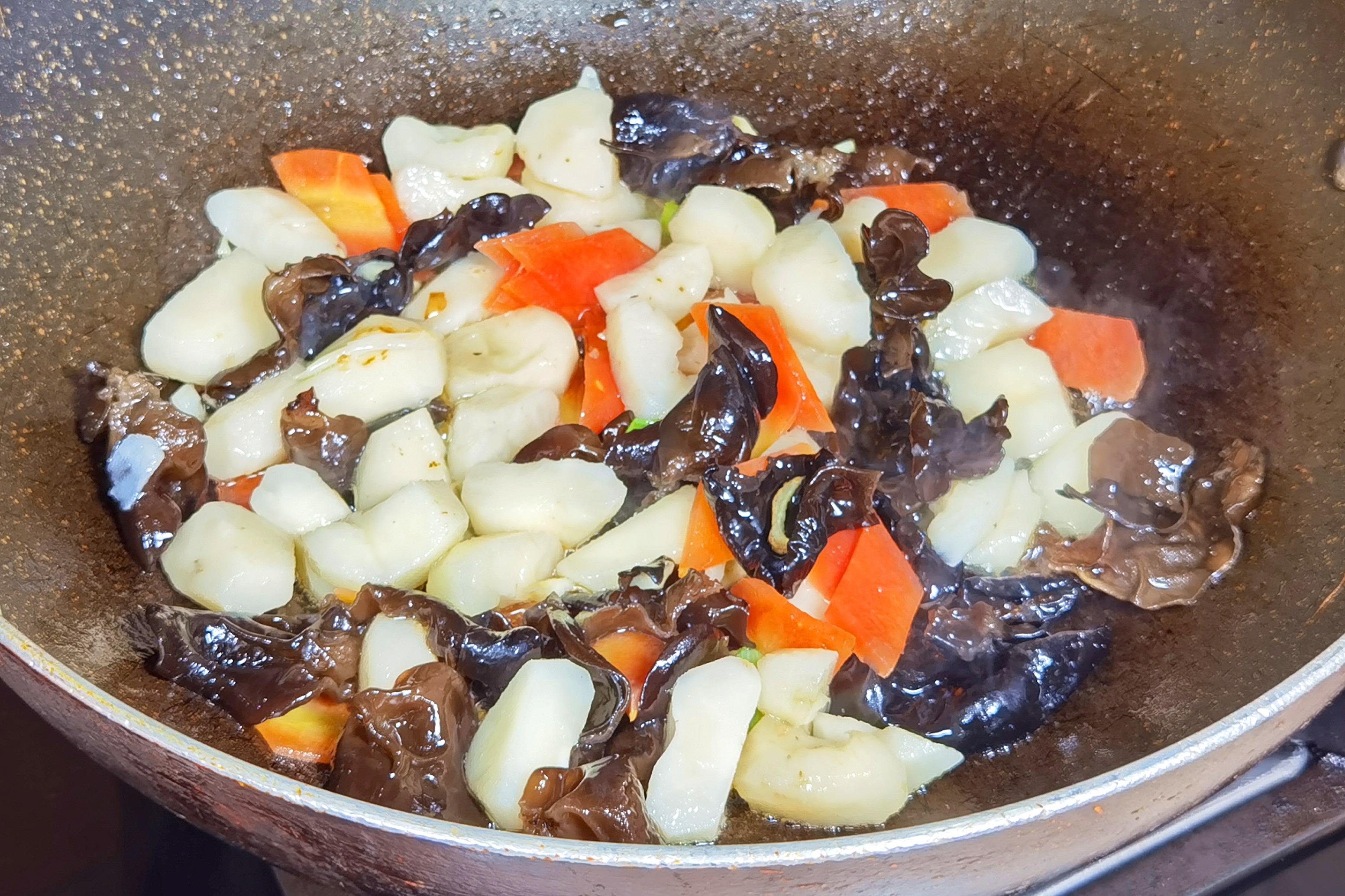 鍋裏燒水,水開後先放胡蘿蔔片,煮1分鐘,再放入黑木耳和馬蹄片,一起再焯1分鐘左右。這一步能讓食材斷生,保持鮮豔顏色,炒的時候更易熟,也更脆爽。撈出後,可以過一下涼水,口感會更脆。