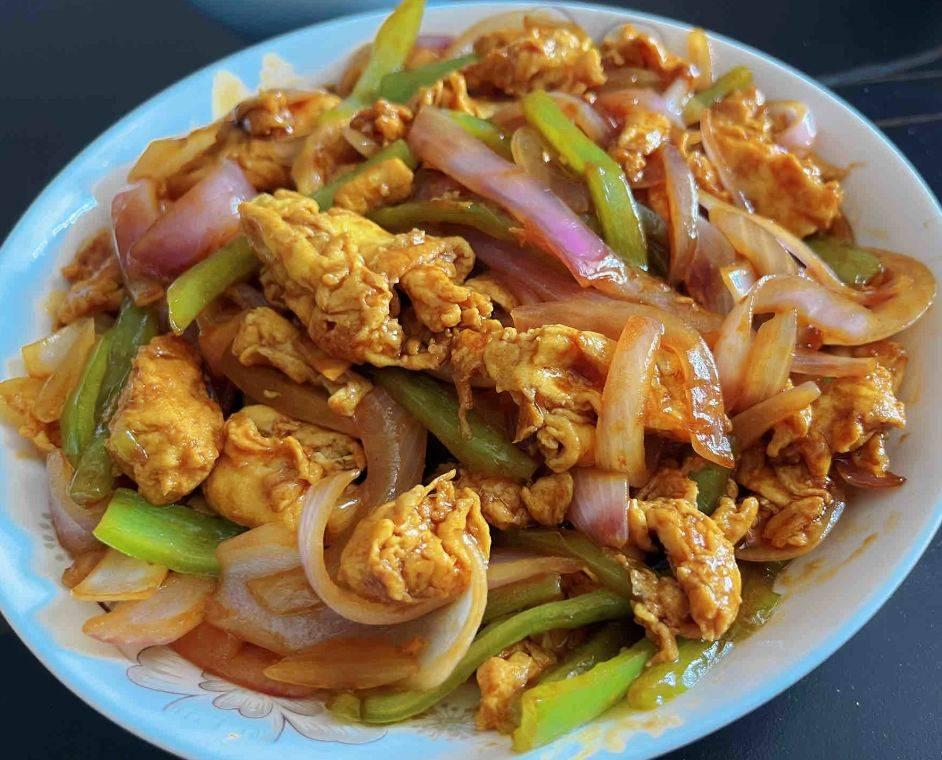 食材:洋蔥2個,雞蛋3個,鹽, 生抽,青椒1個