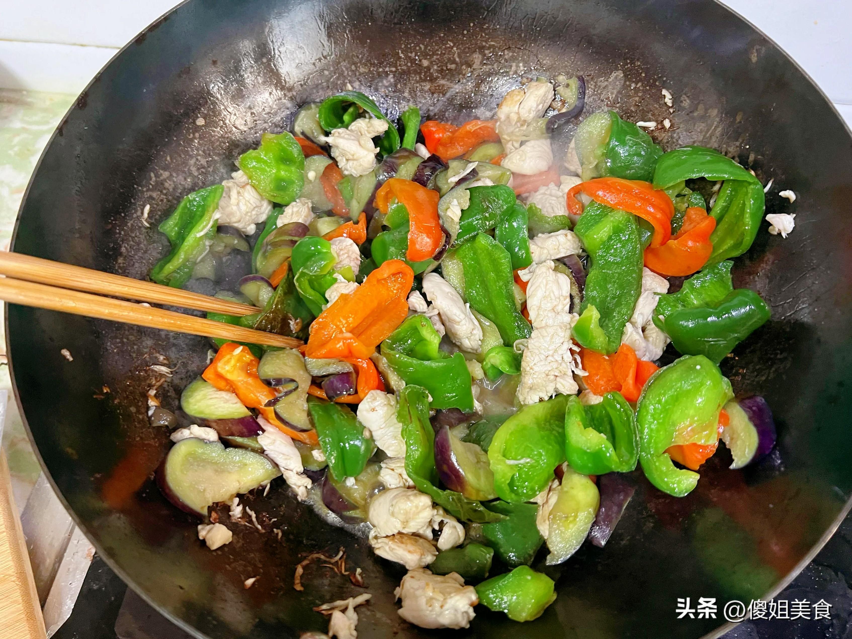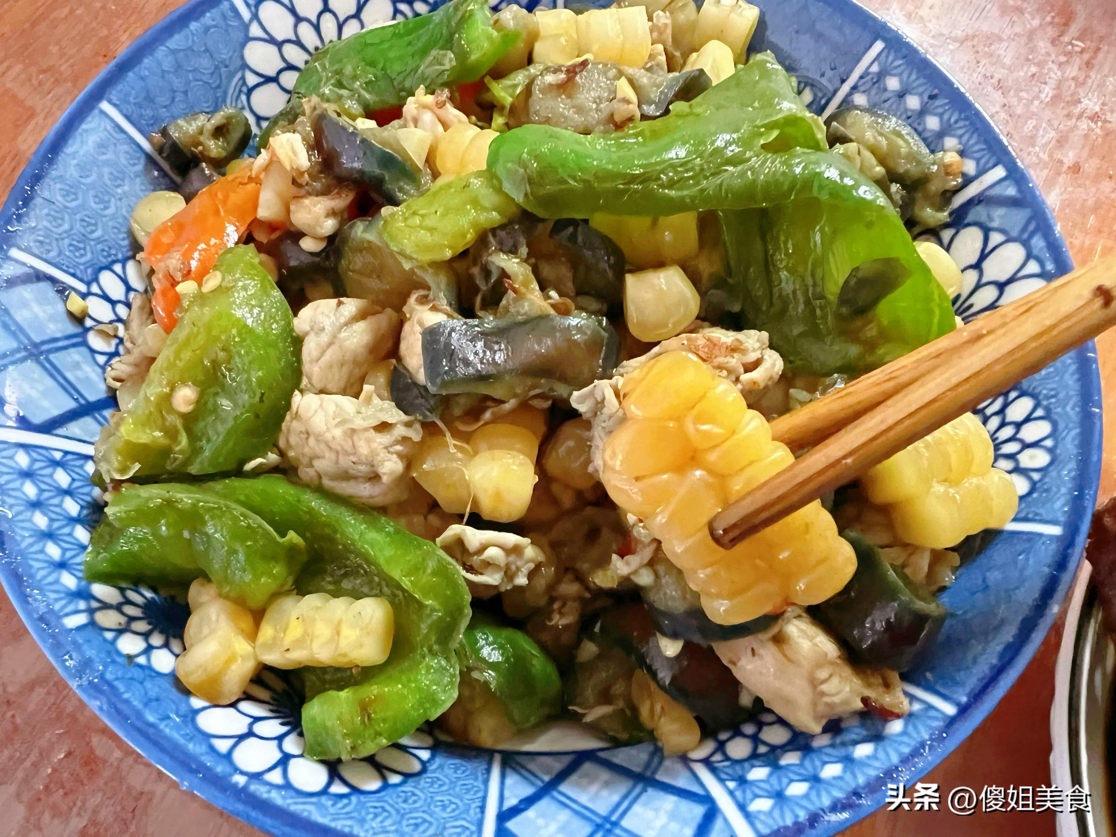 茄子切成小丁塊,青椒也切成差不多大小,雞胸肉切塊後用少許料酒和生抽醃一下。準備工作做好,鍋裏熱油,先把雞胸肉下鍋翻炒至變色,接着下茄子和青椒,最後加入玉米粒,加點鹽、少許生抽,翻炒均勻,香氣就出來了。這道大雜燴菜色彩豐富,看着就有食慾。