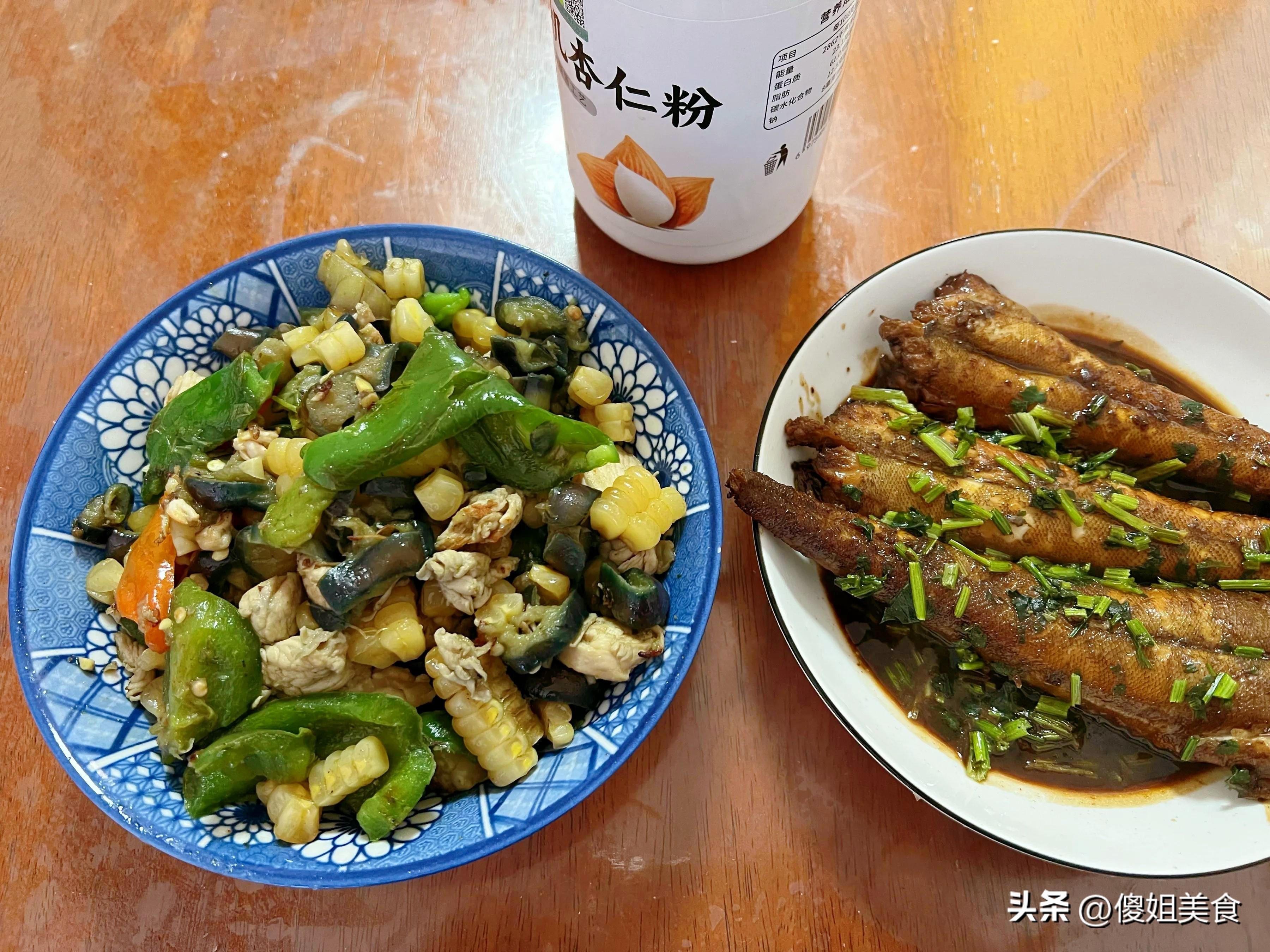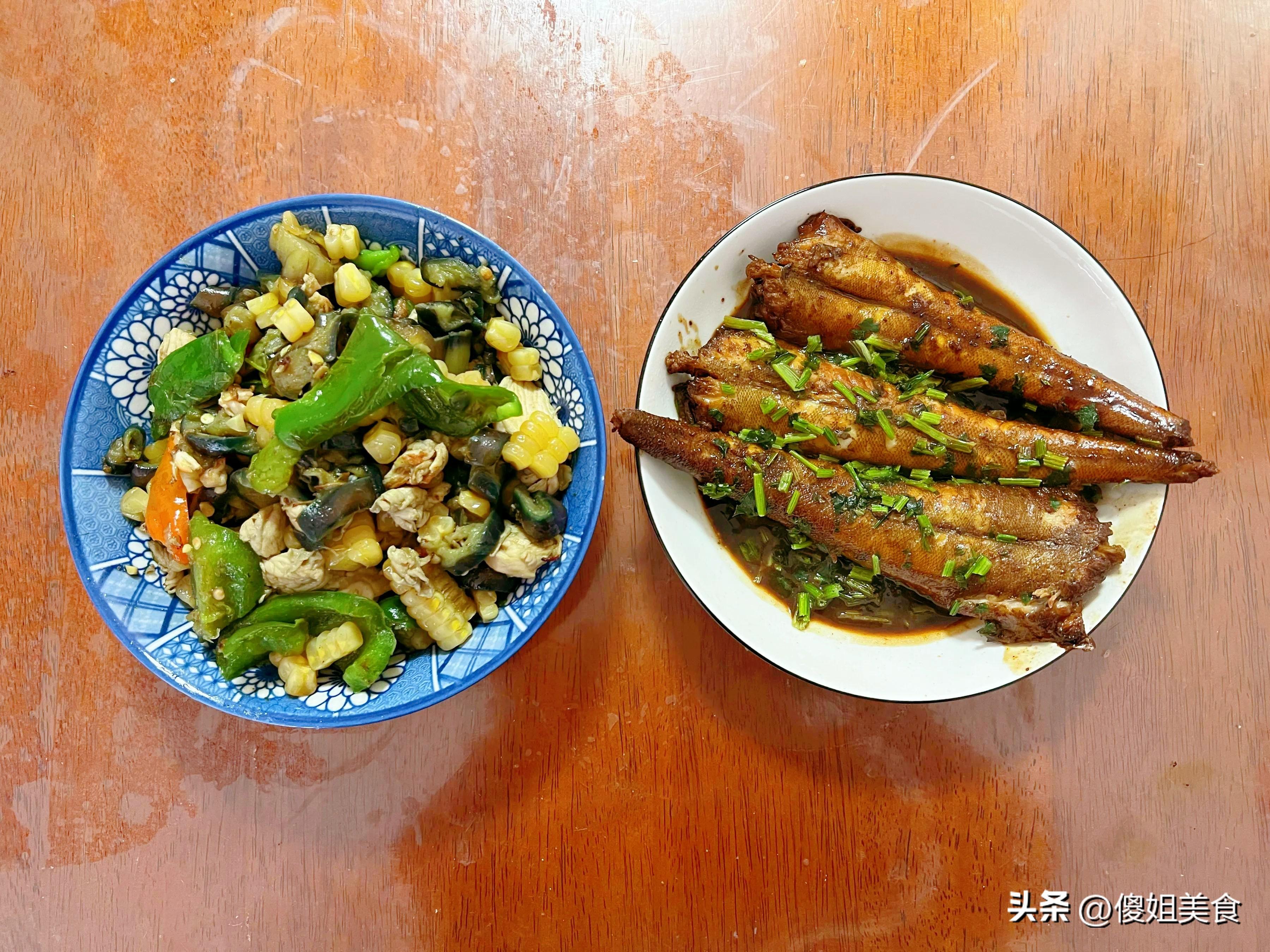 就像今天這餐,大雜燴菜裏的雞胸肉提供了蛋白質,卻不會像豬肉那樣油膩;茄子吸油但炒的時候我油放得少;青椒維生素豐富;玉米是粗糧,對身體好。小魚更不用說了,海魚蛋白質優質,脂肪含量低,醬燜的做法既入味又不會太鹹。