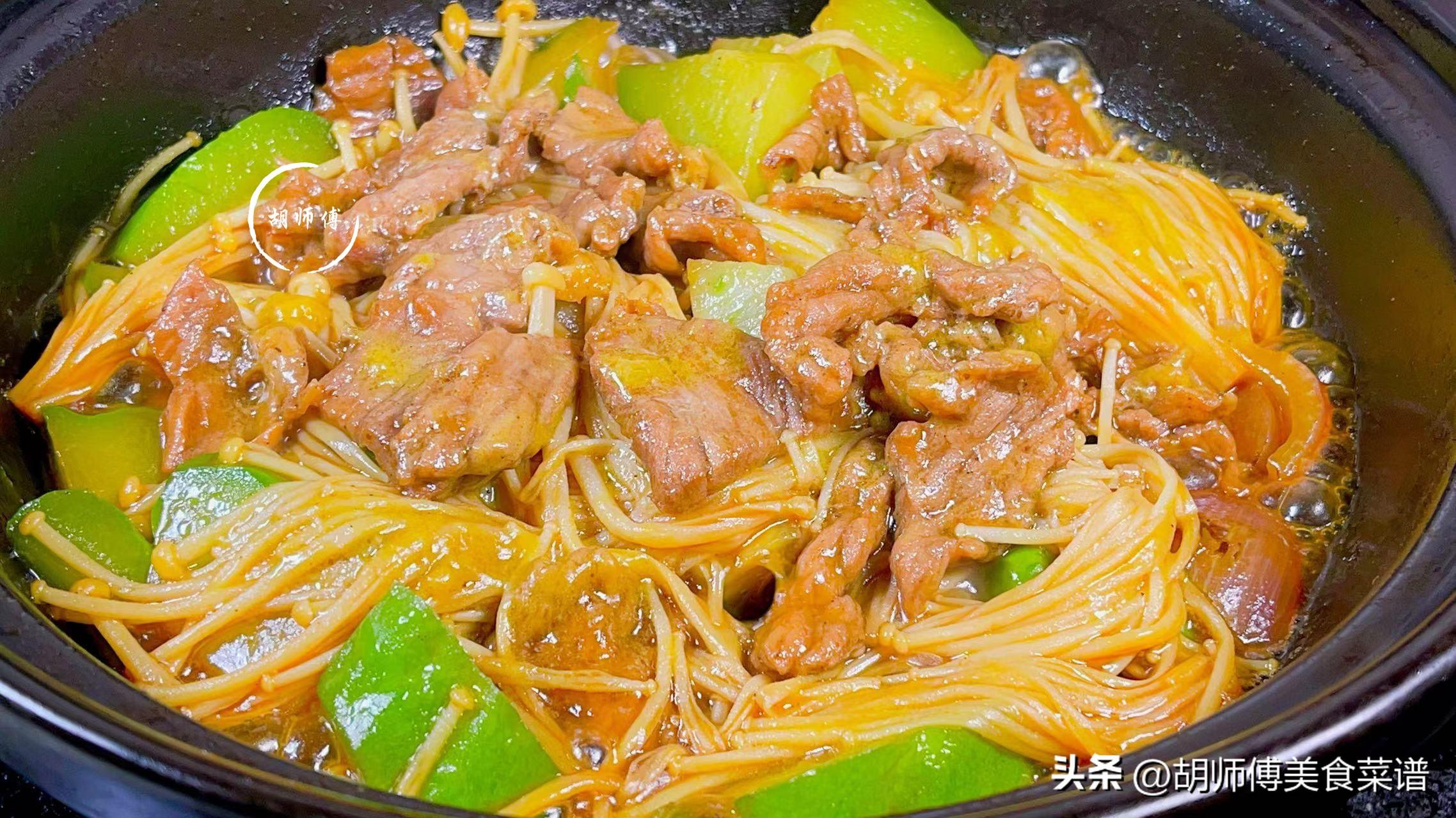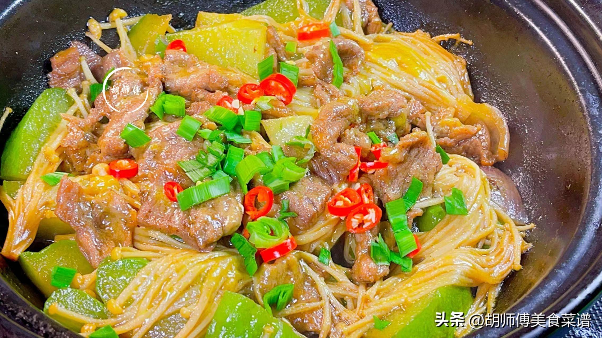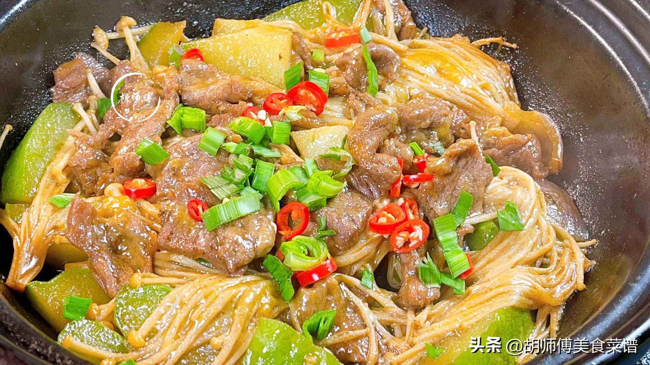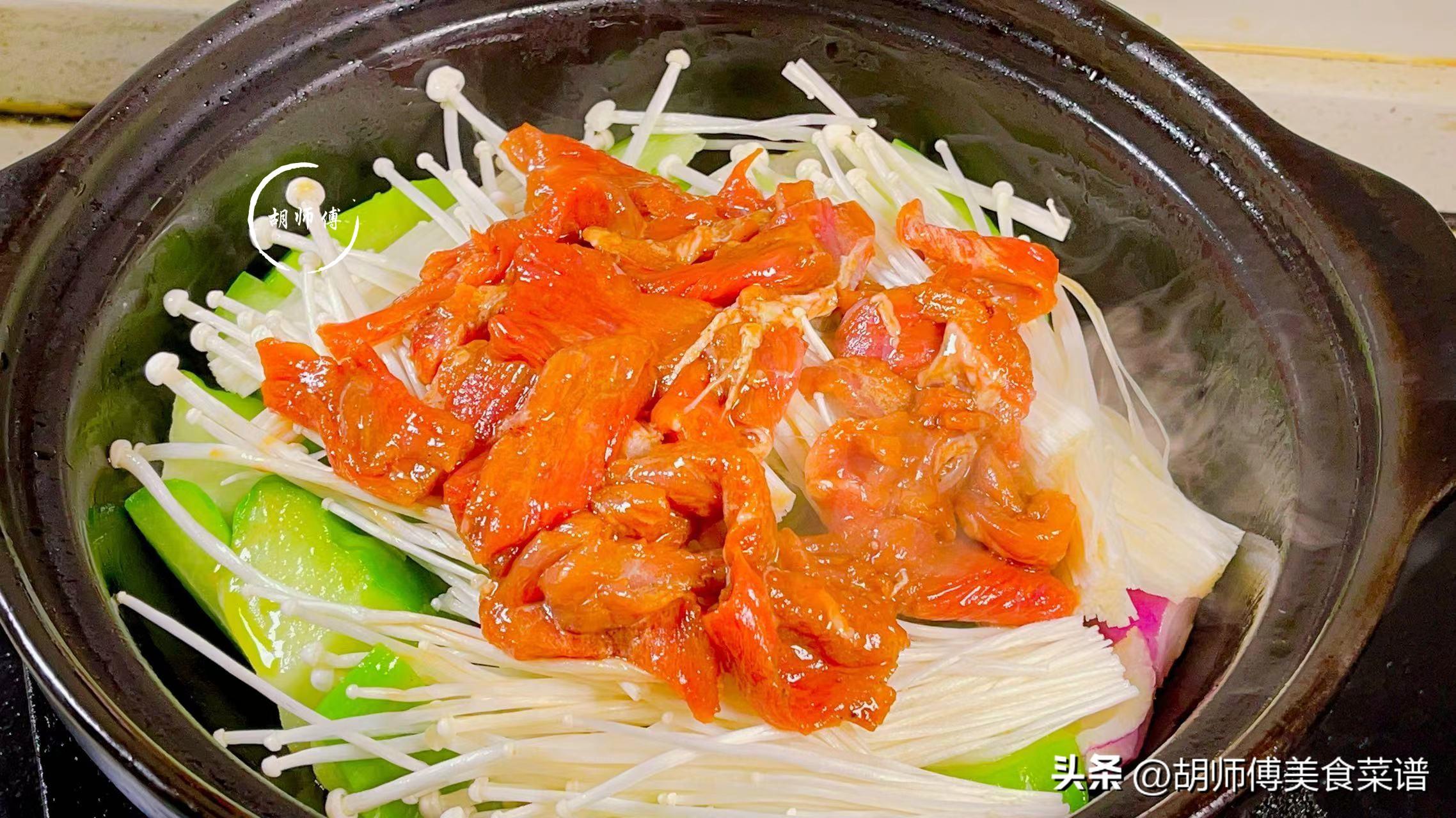 第五步:把金針菇先擺到佛手瓜上,然後再把牛肉均勻整齊的擺在佛手瓜上,接着淋上小半勺水,把砂鍋蓋住,中火將佛手瓜燜10分鐘,中途不要揭開鍋蓋,這樣纔可以將牛肉、佛手瓜完全燜熟。