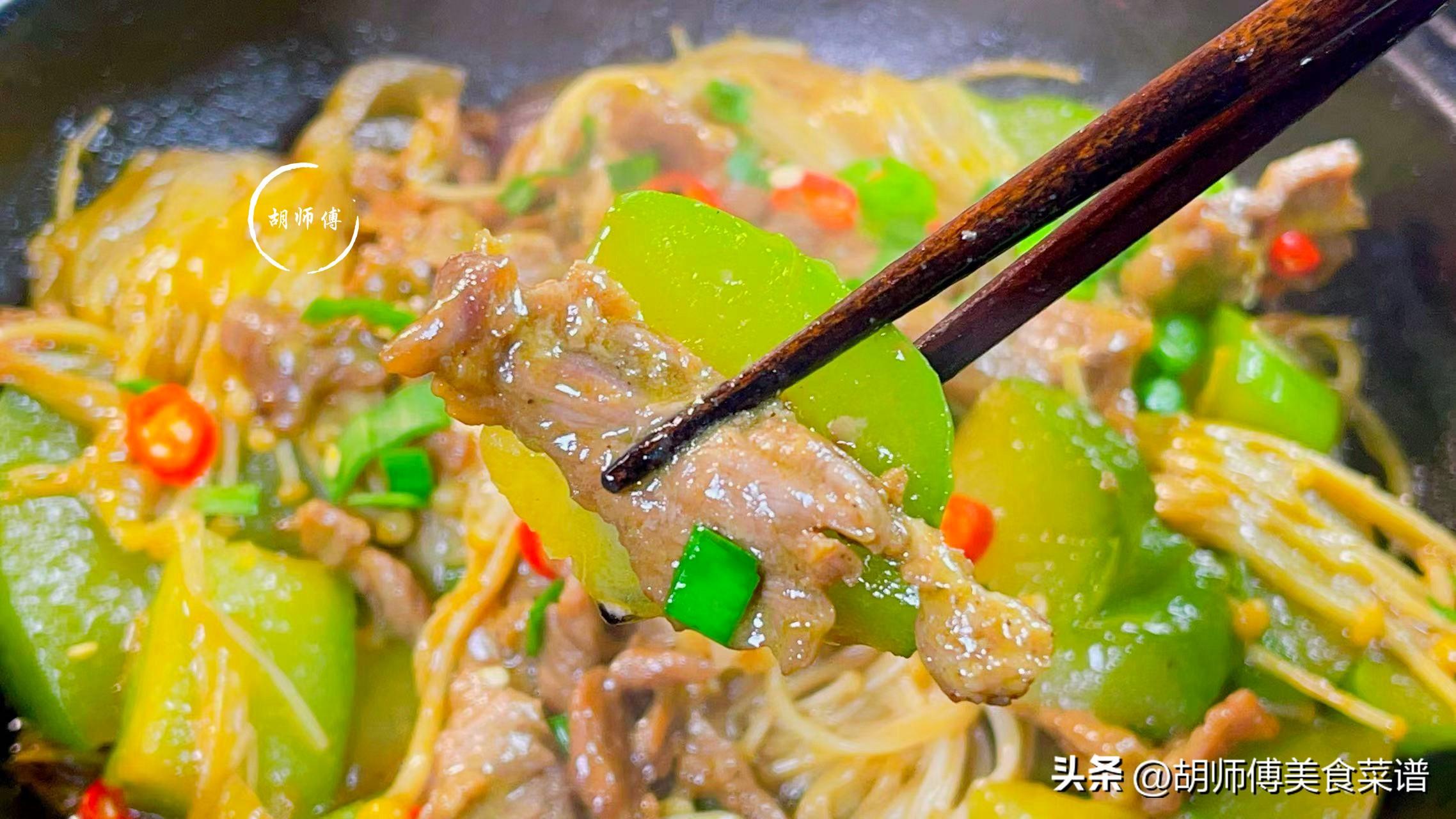 【所需食材】:佛手瓜1個、牛裏脊150克、洋蔥100克、金針菇100克、青紅小米椒、食鹽、澱粉、蠔油、花椒油、食用油適量。
