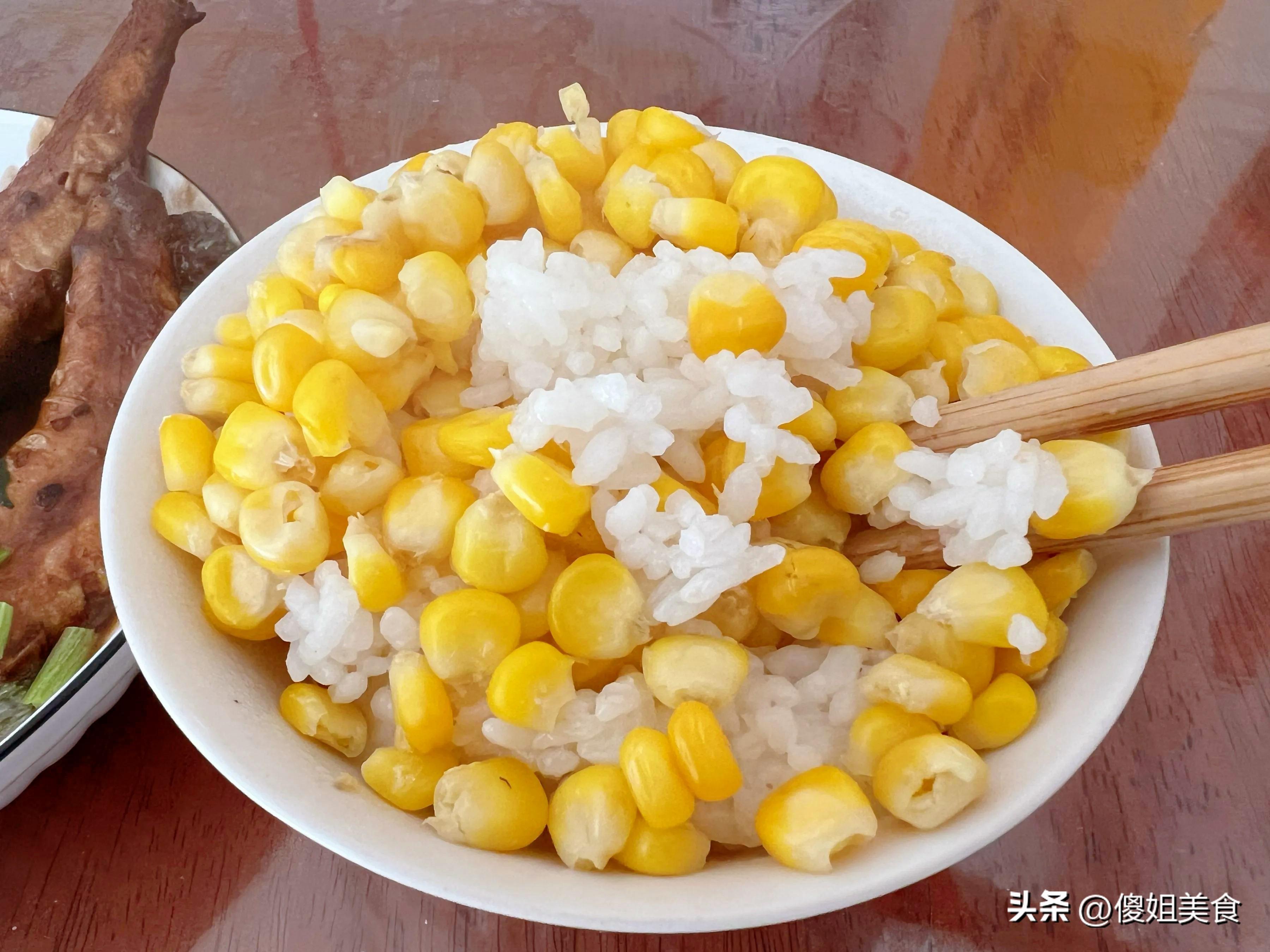 自家種的玉米就是不一樣,甜度適中,煮熟冷凍後再蒸,依然保持着那股子清甜。和大米一起蒸熟後,玉米粒會變得飽滿彈牙,每一口米飯裏都能嚼到幾顆,那種突如其來的甜味和口感,讓平平無奇的白米飯一下子有了靈魂。