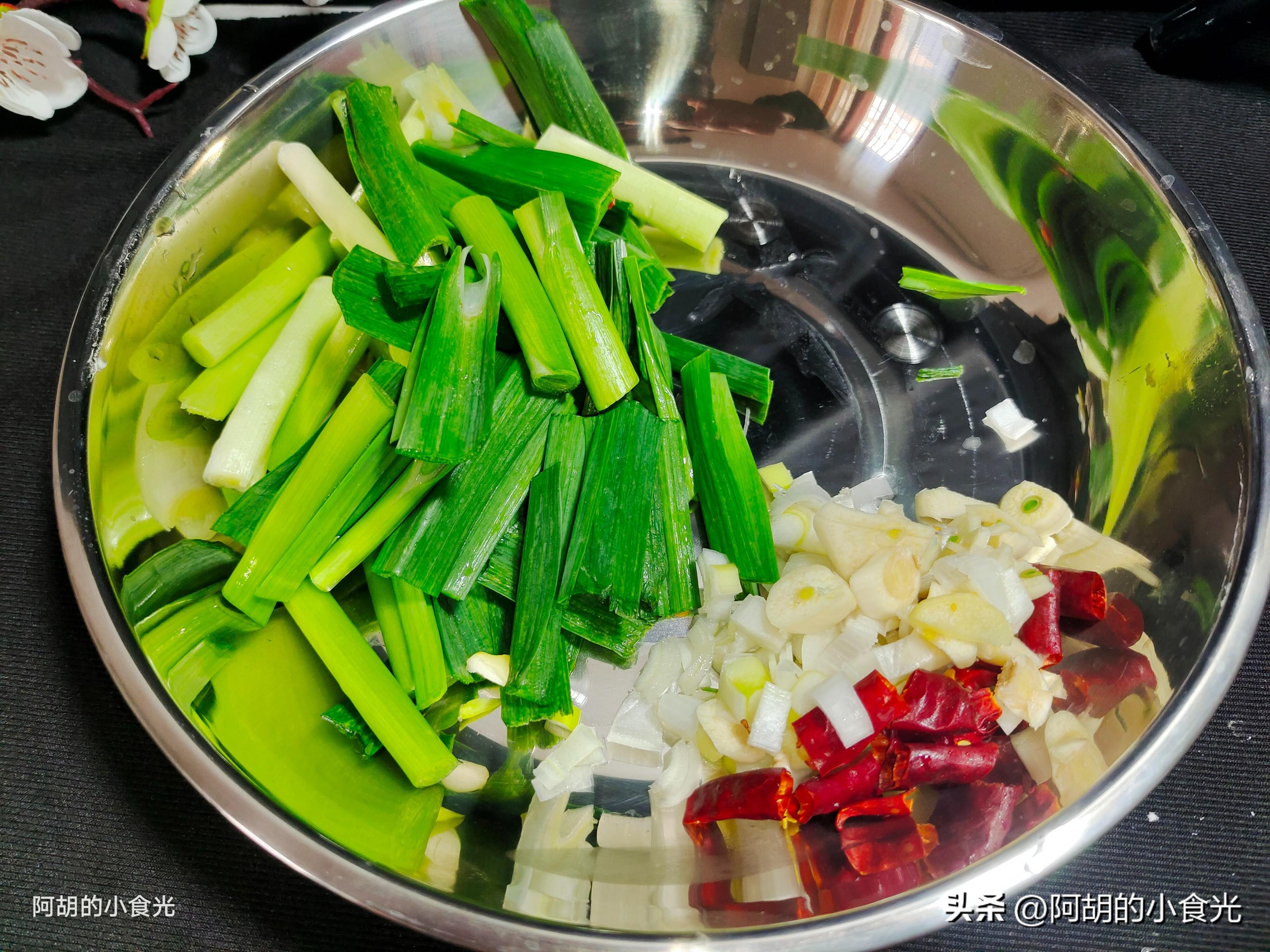 第三步:其它的配菜有青蒜兩棵,洗乾淨後將其切成小段待用。再準備一些蔥薑蒜和兩個幹辣椒作爲小料使用,還有一把乾粉條用溫水充分泡軟後備用。