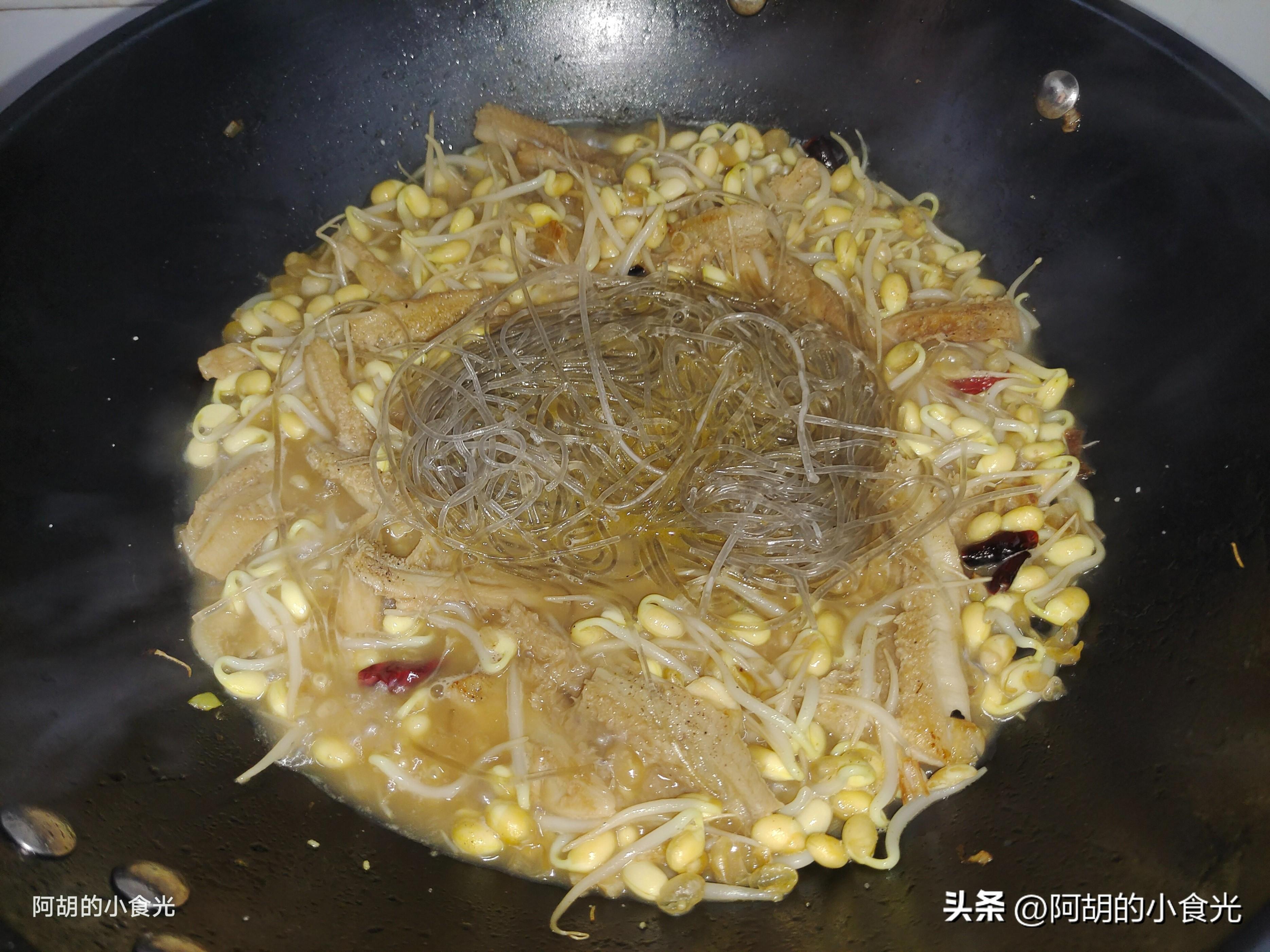 第五步:把瀝乾水分的黃豆芽也倒入鍋中,開最大火翻炒一分鐘,而後取適量的開水倒入鍋中,將泡軟的粉條也入鍋,調味就加入一些食鹽、少許的雞精和胡椒粉,簡單翻拌後加蓋燜煮三五分鐘。