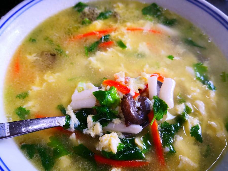 海蔘加上海鮮茹還有蝦仁一起做湯,鮮上加鮮,鮮得不得了,喫上一口就停不下嘴,太過癮了!