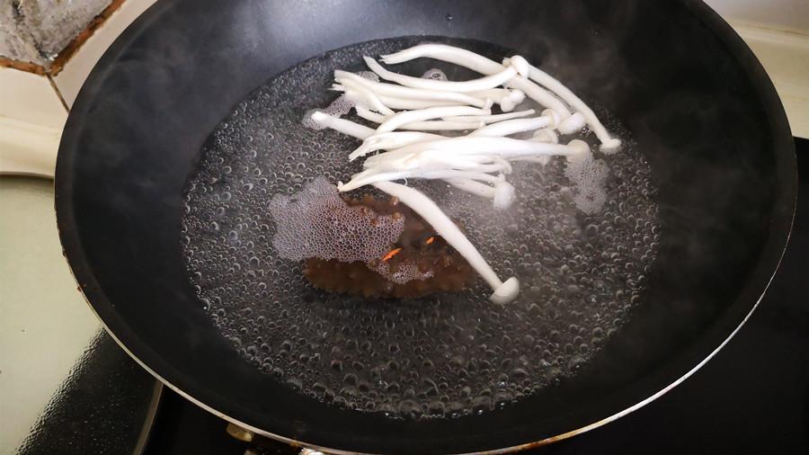 2.起鍋燒水,水開後放入處理好的海蔘和海鮮菇,焯燙50秒後撈出,過涼後再分別切成小段備用。