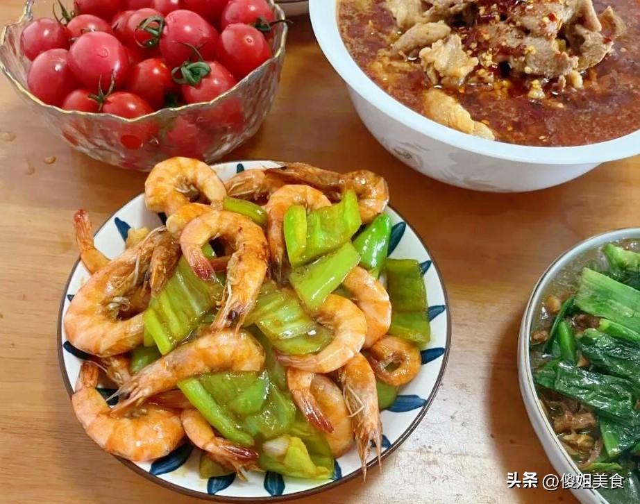 大蝦剪去蝦鬚,去除蝦線,青椒切塊。熱鍋涼油,先下蒜片爆香,然後把大蝦倒進去翻炒到變色,淋一點點醬油增色增香。接着倒入青椒塊,一起翻炒,青椒斷生了,加點鹽就可以出鍋。蝦的鮮味和青椒的清香融合在一起,好喫到停不下來。